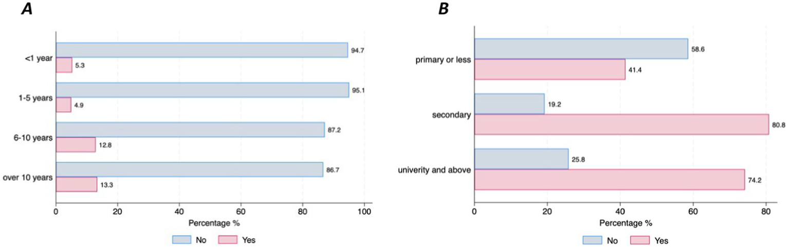 Preferences for using smartphones by disease duration and educational level. (A) Preferences for smartphones by PD duration. (B) Preferences for smartphones by education.