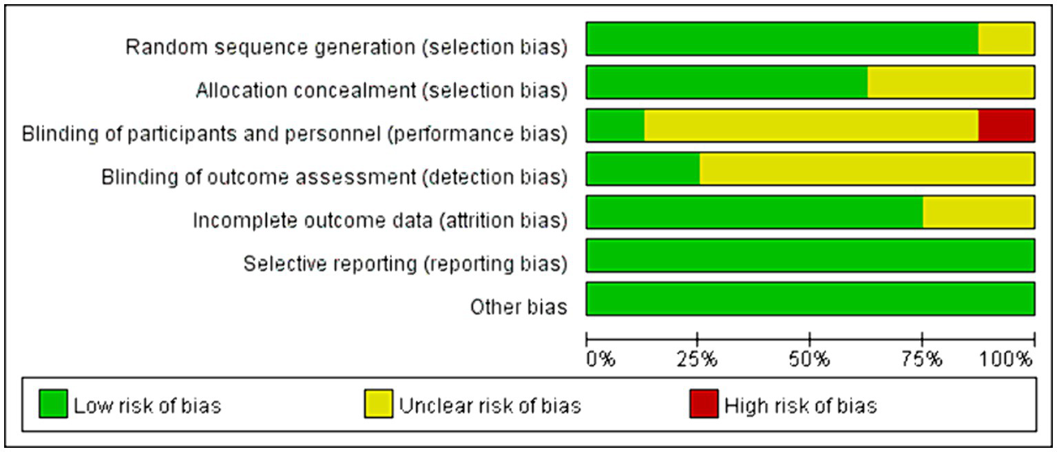 Among all the eligible studies, 8 were randomized controlled trials (11, 19, 21–24, 26, 28), and the Cochrane risk bias tool was utilized for quality assessment, consisting of a total of 7 evaluation criteria. Seven of the articles provided detailed descriptions of the randomization process, with two (11, 21) utilizing computer software randomization and five (19, 22–24, 26) using the random number table method. One study (28) mentioned “random” without specifying further details. Five studies (11, 19, 21, 23, 24) employed sealed envelopes for allocation concealment, while three (22, 26, 28) did not mention any allocation hiding methods. Only one study (19) used a triple-blind approach and the rest did not discuss blinding or allocation hiding, resulting in high performance bias levels. Some missing data led to high attrition bias. There was no evidence of selective reporting bias in any of the literature and it was rated as “low risk.” No other significant risks were identified in any of the literature, so other biases were evaluated as “low risk.” Specific information on bias assessment is presented in Figure 2. The remaining 6 non-randomized controlled trials (12, 20, 25, 27, 29, 30) were evaluated by MINORS5, and the results were shown in Table 3.