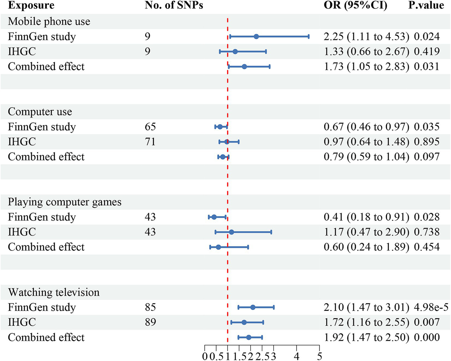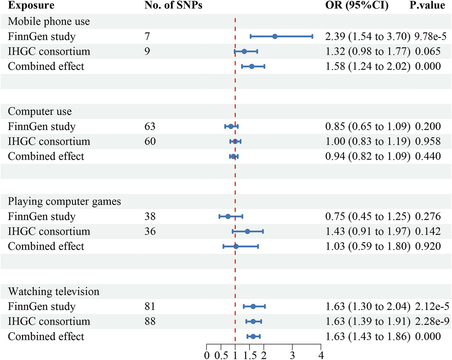 For digital device use, the F-statistics for IVs were all greater than 10, ranging from 29.7 to 151.8, indicating no weak instrument bias (Supplementary Tables 3.1–3.4). The average F-values for the SNPs related to the four types of devices were as follows: mobile phone use (38.0), computer use (38.1), playing computer games (39.5), and television watching (41.5).
