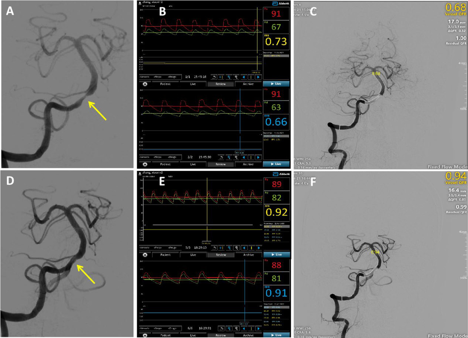 Typical case: A 52-year-old male was admitted due to intermittent dizziness with blurred vision in the right eye for 20 days. Panel (A) showed severe basilar artery stenosis (yellow arrow) before surgery; (B) the CVPR and RFR values of the distal stenosis measured using an invasive pressure wire were 0.73 and 0.66; and (C) the calculated QFRwas 0.68 in the same lesion. The bottom row presented the postoperative figure, and panel (D) showed an obvious improvement in stenosis; (E) the CVPR and RFR values were increased to 0.92 and 0.91; and (F) QFR was noted to have recovered significantly to 0.94.