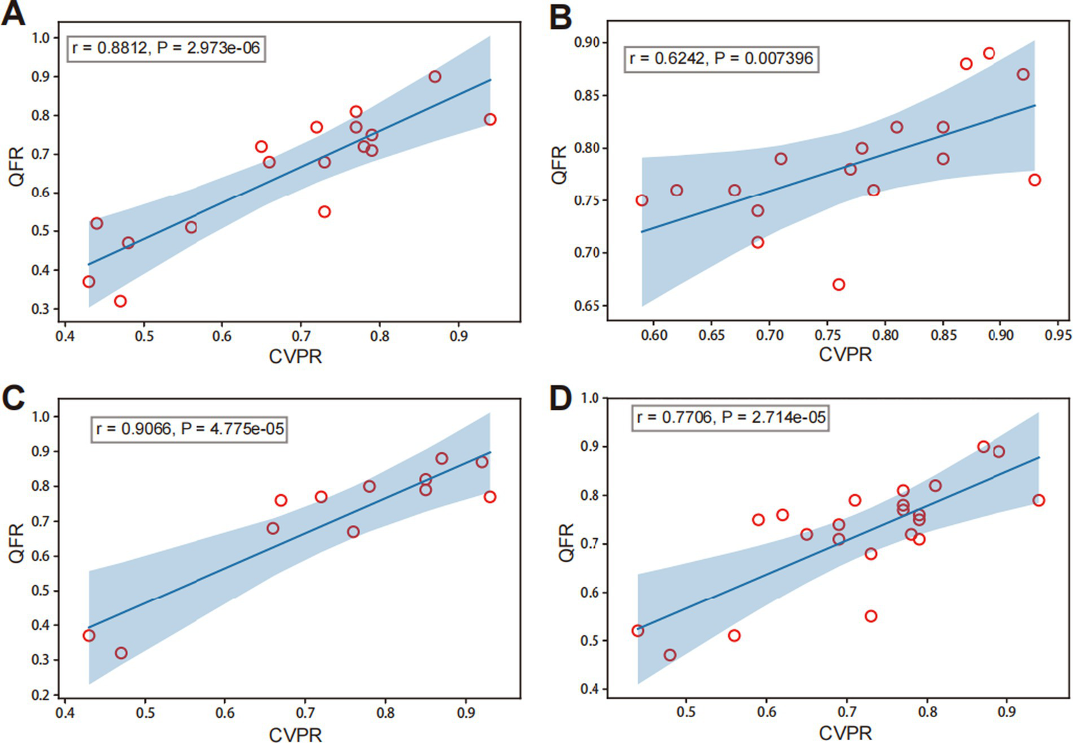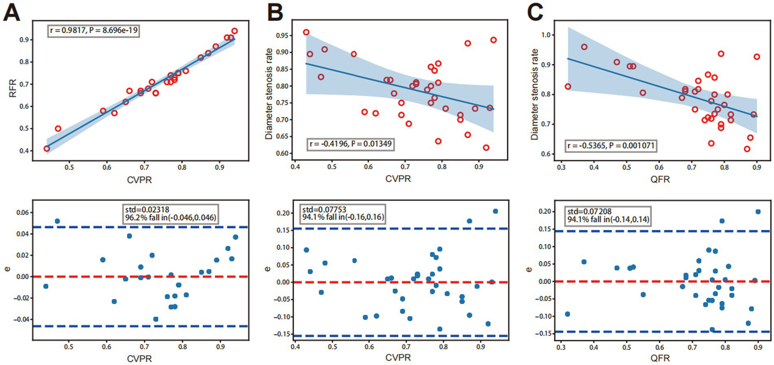 Correlation and consistency between QFR and CVPR. Before interventional surgery, strongly positive correlation (A) and agreement (B) is observed between QFR and CVPR. (C) After interventional surgery, a weakly positive correlation is observed between QFR and CVPR. The light blue area represents predicted “QFR” for a confidence interval of 99%.