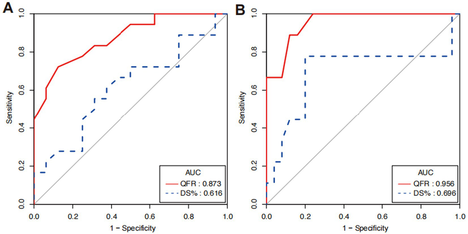 Contrast of diagnostic efficiency between QFR and DS% by ROC analyses. (A) ROC curves for QFR and DS% when CVPR <0.75 and (B) ROC curves when CVPR <0.8.