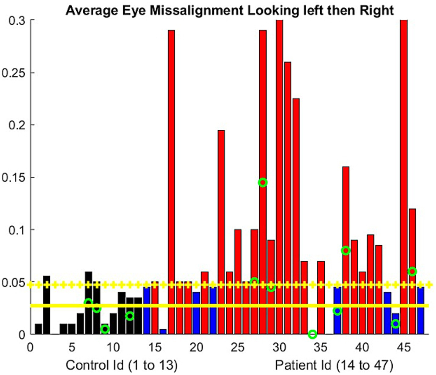 Ocular alignment was assessed by the difference in the barycentric coordinate (0 = no misalignment). The progressive misalignment between both eyes used the least squares approximation of the barycentric coordinate change during the exercise. The controls are represented using a black bar. The patient results are shown using blue bars if there is no significant misalignment developed during the examination and red bars if misalignment was present. The green circle represents the participants older than 70 years. Yellow horizontal lines represent the mean metric output for the control, with the mean plus one standard deviation serving as the threshold to mark the presence of eye misalignment.