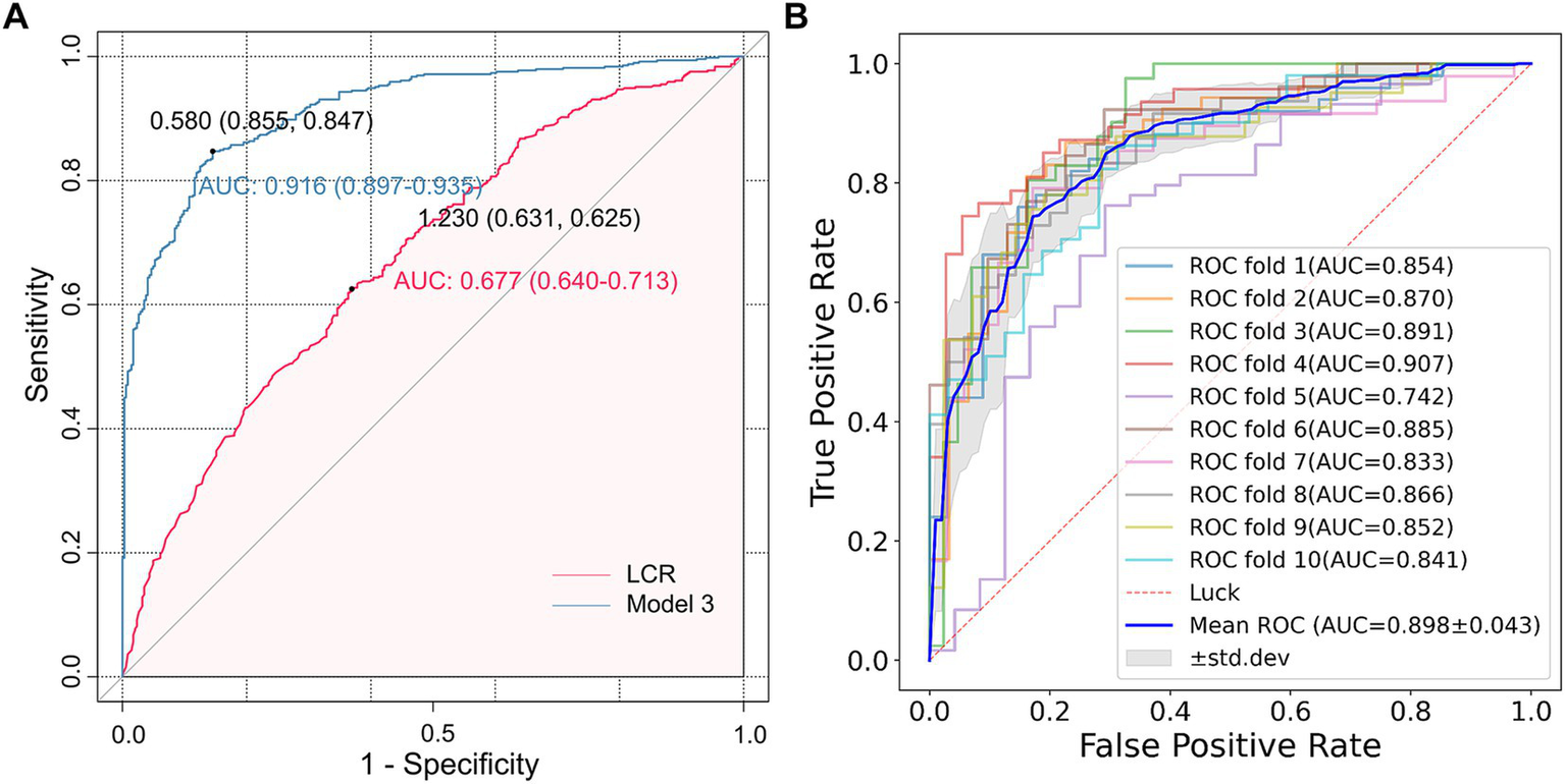 Data from 835 CSVD patients were analyzed using univariate and multivariate logistic regression to determine CSVD-associated factors. Multivariate models assessed the association between LCR and CSVD, including common imaging markers. Subgroup analysis by age, sex, smoking history, hypertension, lipid levels, and other factors was conducted. The receiver operating characteristic curve analysis and 10-fold cross-validation were performed to evaluate the predictive performance of LCR.