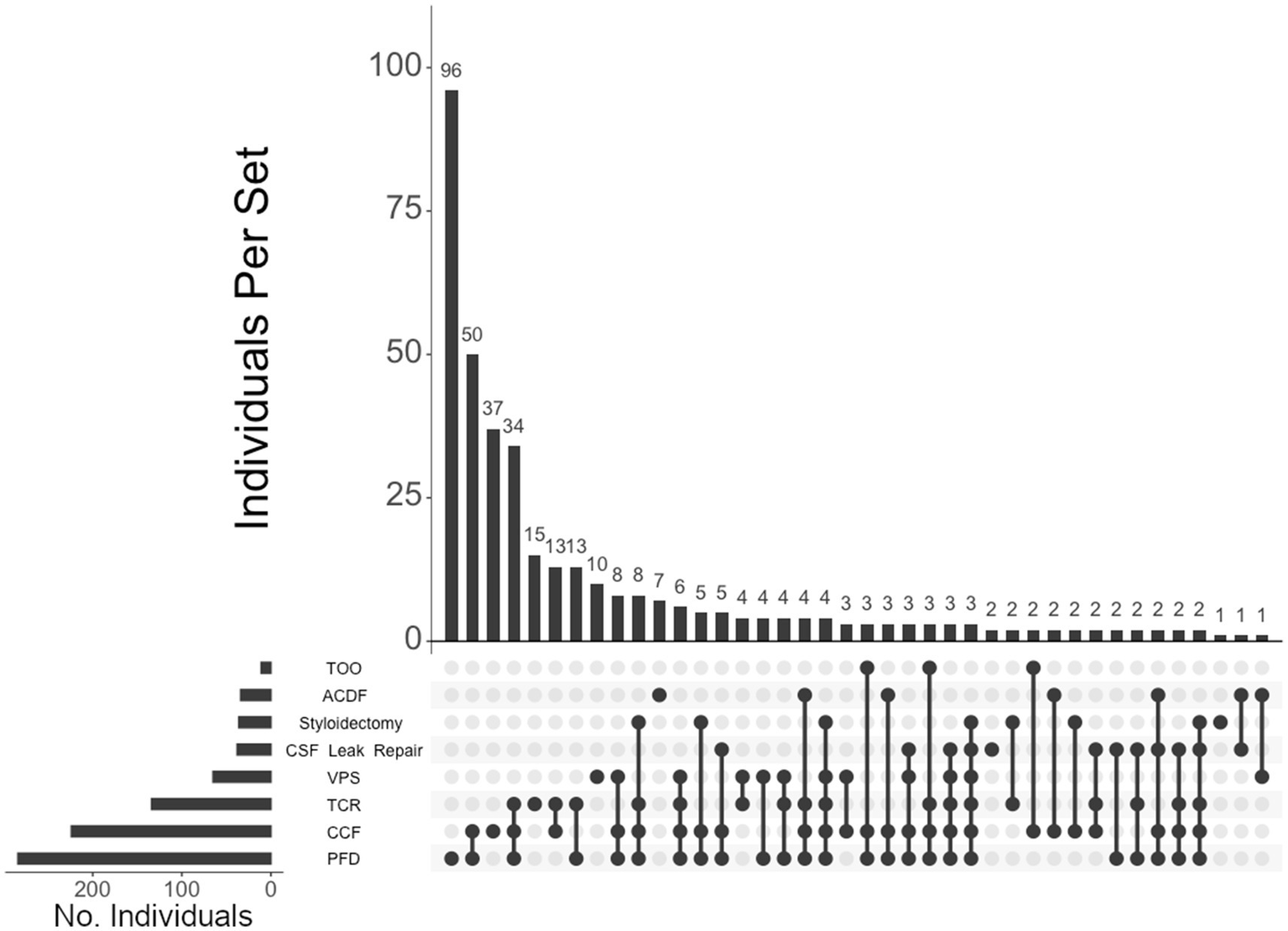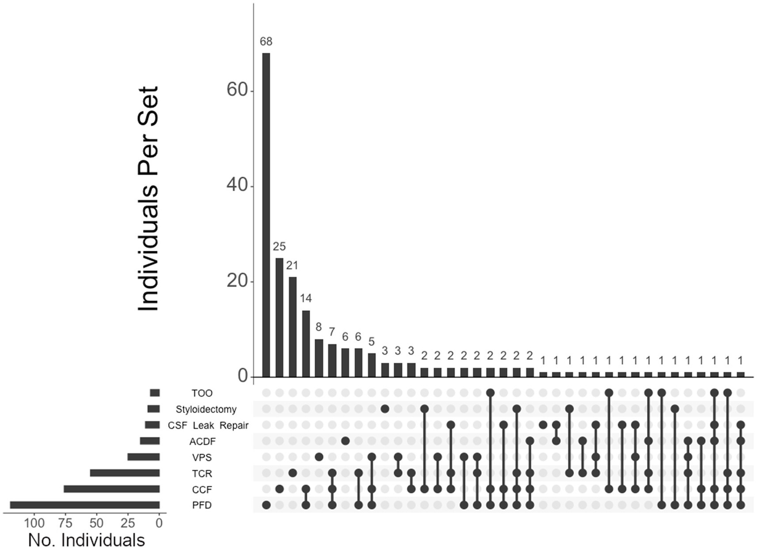 UpSet plot of the most frequent surgical intersections among individuals presenting with CMI. Each column represents the intersection (or lack thereof) of one or more surgeries, with the number of individuals in each grouping listed on top of each bar. Each row indicates groupings of data (sets) corresponding to the surgeries listed on the left. Dark circles indicate the placement of a surgical procedure within a group. Groupings comprised of two or more procedures are indicated by circles connected by a line. Data corresponds to the frequency detailed in Table 2. The top 40 intersections are illustrated. Surgical procedures: posterior fossa decompression (PFD); craniocervical fusion (CCF); tethered cord release (TCR); ventriculoperitoneal shunt (VPS); CSF leak repair; styloidectomy; anterior cervical discectomy and fusion (ACDF); transoral odontoidectomy (TOO).