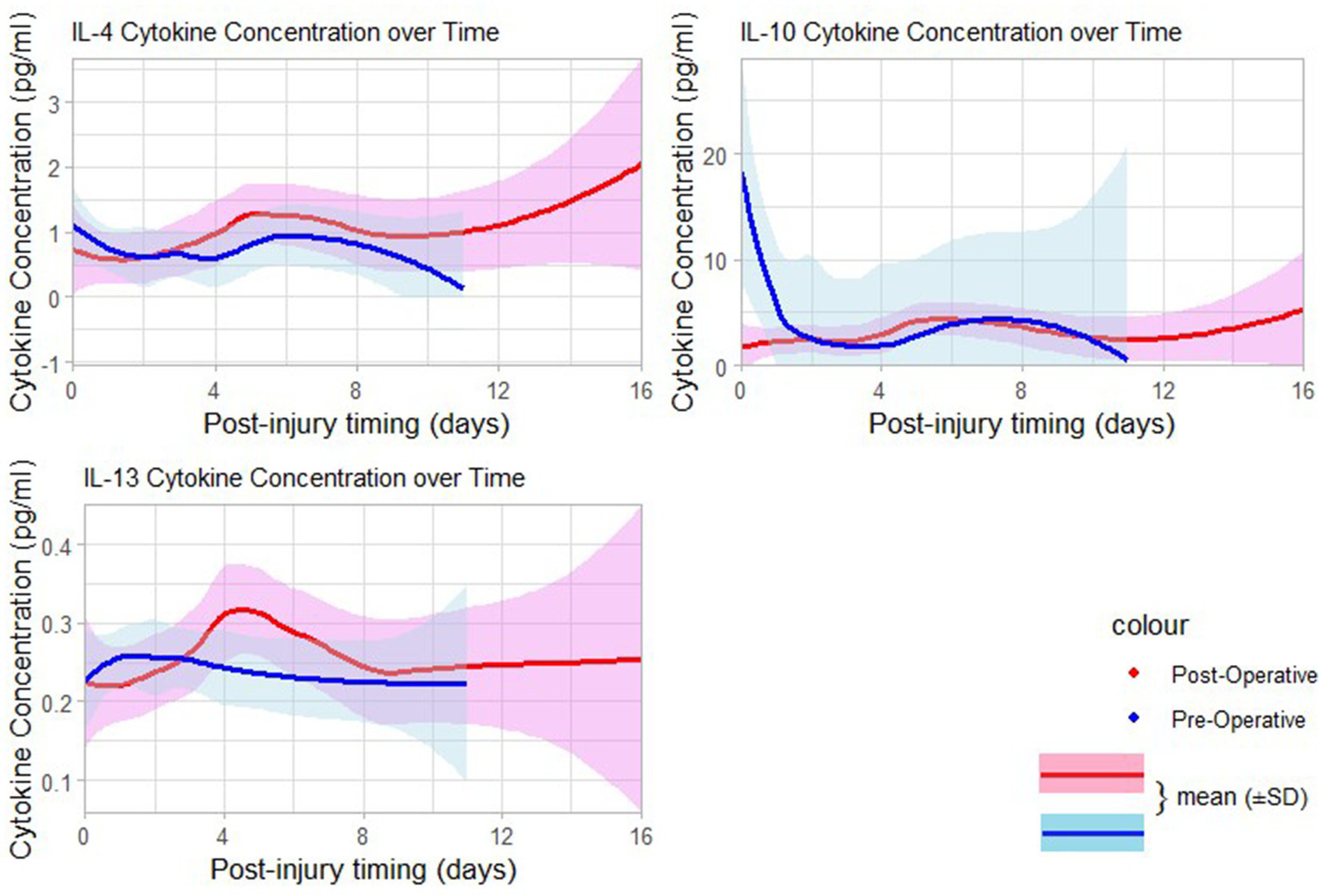The relationship between the standardized concentrations of the 27 cytokines and the duration (in days) between injury and sample collection was assessed using a matrix plot. The plots for the pre-and postoperative serum cytokines were further stratified by the nature of inflammatory actions of the cytokines (pro- and anti-inflammatory). We also visually compared the levels of inflammatory cytokines between the delayed and early groups using the box plots. Pre-and postoperative levels of inflammatory cytokines and their change in concentration were compared between the categories of surgical timing, neurological variables, radiological variables, and clinical outcomes variables, using the t-tests and analysis of variance as appropriate. Statistical significance was set at p < 0.05.