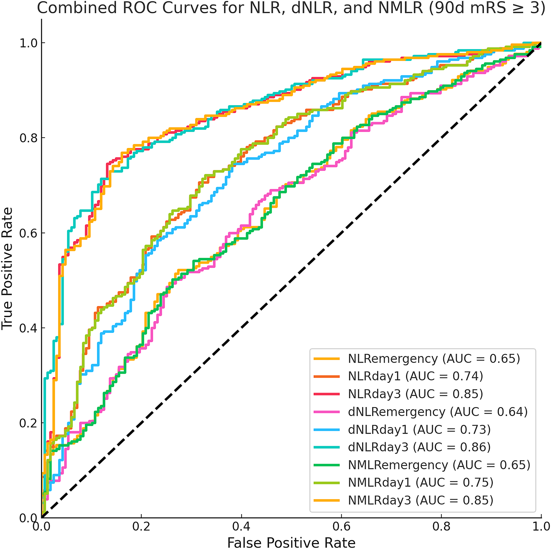To evaluate the predictive performance of inflammatory markers, we analyzed the predictive value of the NLR, dNLR, and NMLR at three time points (at admission, 24 h, and 72 h post-MT) for the primary and secondary endpoints. Receiver operating characteristic (ROC) curves were constructed, and the area under the curve (AUC) and its 95% confidence interval were calculated. The optimal cutoff value was determined via Youden’s index (maximum value of sensitivity + specificity – 1), and the corresponding sensitivity, specificity, positive predictive value, and negative predictive value were calculated.