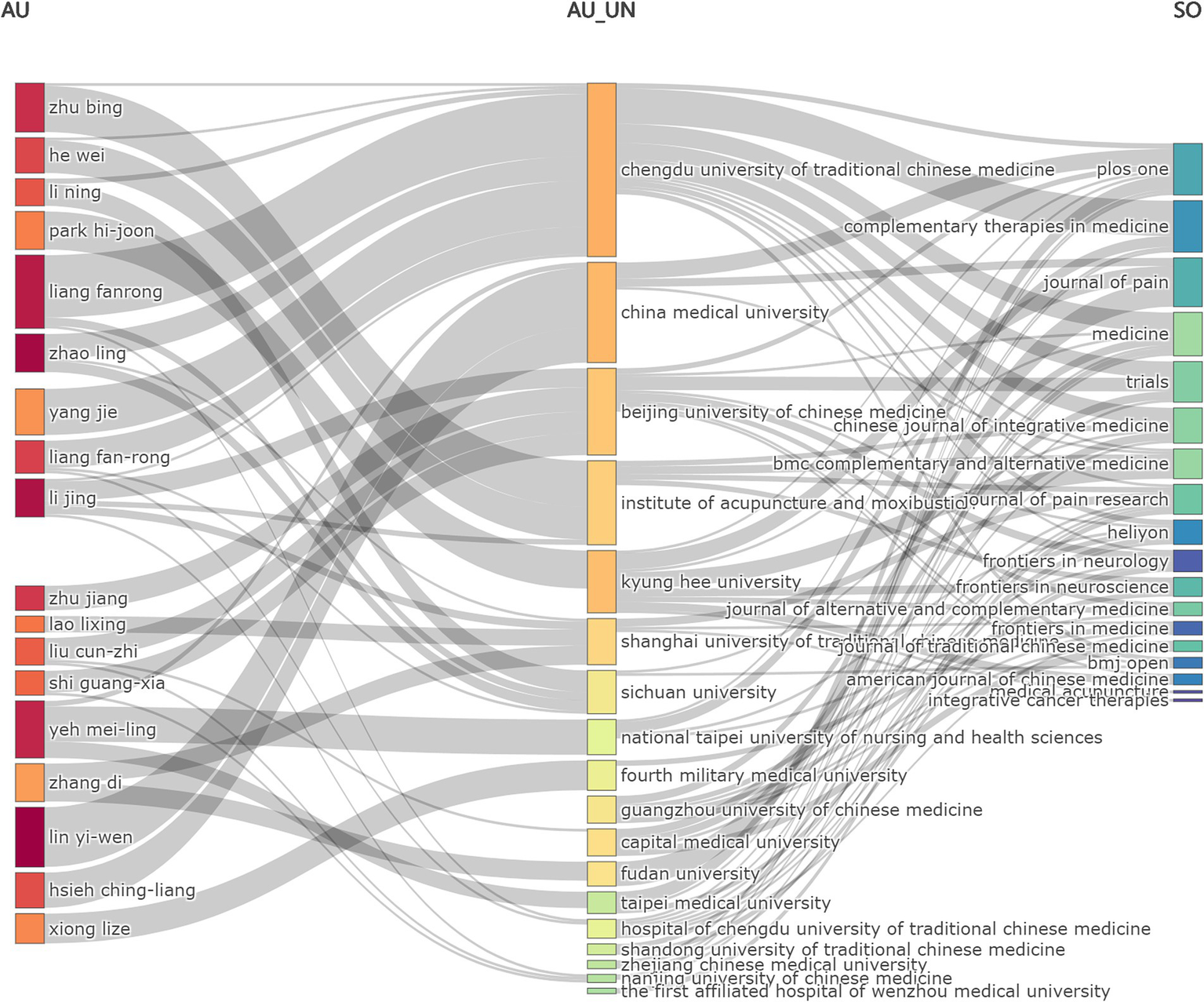 Sankey diagram of the publication related to “acupoints” and “pain” in the past 15 years. Sankey diagram showed the flow and relationship of the three fields: author (AU)-affiliated institution (AU_UN)-source (SO) for global publications. Different lines represented different diversion situations, and their length proportionally showed the number of publications contained in this branch.