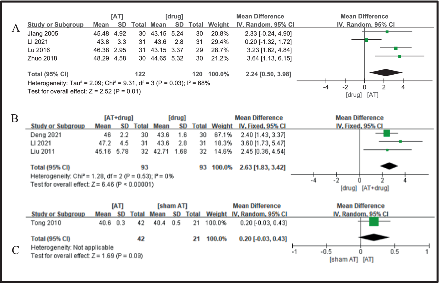 A Forest plot for MNCV of the median nerve according to the comparison of (A) AT vs. Drug, (B) AT plus Drug vs. Drug, (C) AT vs.sham AT.
