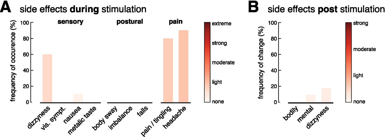 Safety and tolerability of stimulation. Frequency and intensity of side effects experienced during (A) and 10 min after (B) a long-term stimulation (2 h) with the mobile stimulation device. During stimulation, 60% of participants reported mild dizziness that resolved immediately after, while 90% experienced mild headaches and 80% reported tingling at the electrode sites. Adjusting electrodes reduced discomfort in most cases. No serious side effects were reported after the stimulation.