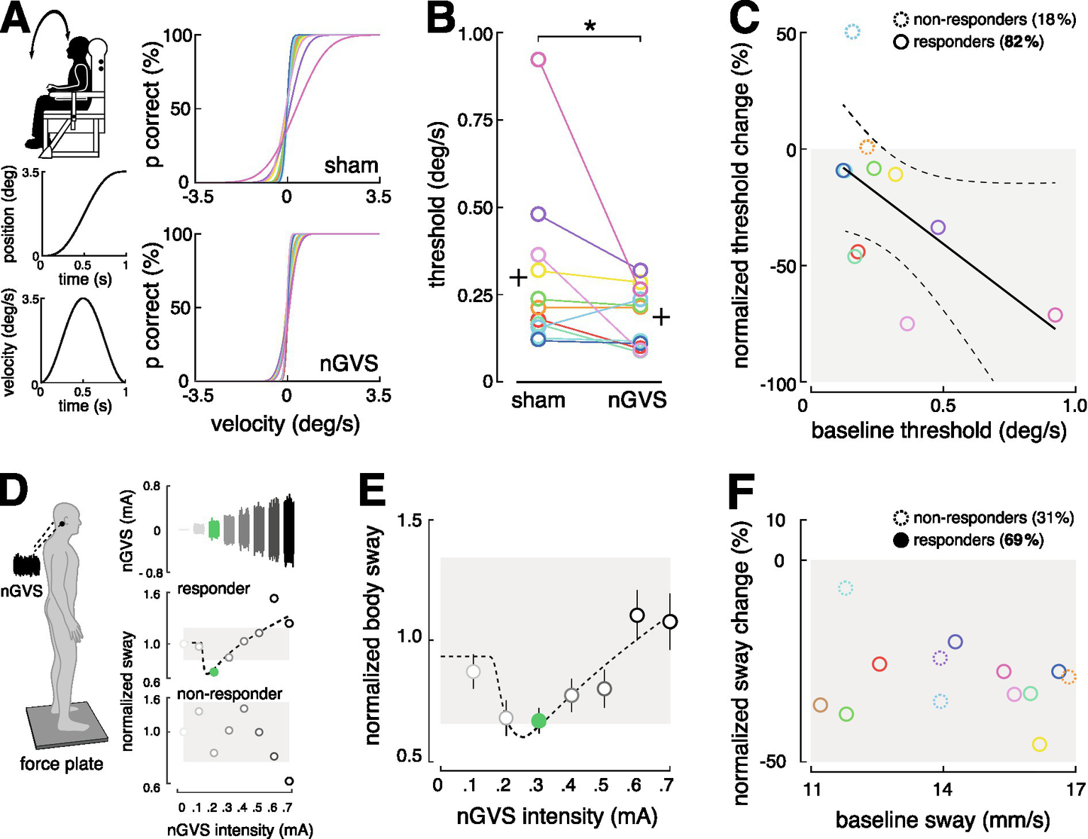 Therapeutic effects of stimulation. (A) The effect of nGVS stimulation on vestibular perception in the roll plane was examined using a psychophysical paradigm on a motion platform. Individual psychometric curves for perceptual performance under zero-current sham vs. nGVS stimulation were calculated. (B) The nGVS stimulation led to an effective reduction in the perceptual threshold in 82% of the participants. (C) Participants with poorer baseline performance were more likely to benefit from the stimulation. (D) The effect of nGVS stimulation on postural control were assessed on a force plate. Participants who showed reduced body sway at intermediate nGVS intensities, and no effect or increased body sway at low or high intensities, were classified as responders (69%); the others were classified as non-responders (see exemplary participant outcomes). (E) Average modulation of body sway from all responding participants. (F) No correlation was observed between baseline performance and the response or non-response to the stimulation. nGVS, noisy galvanic vestibular stimulation.