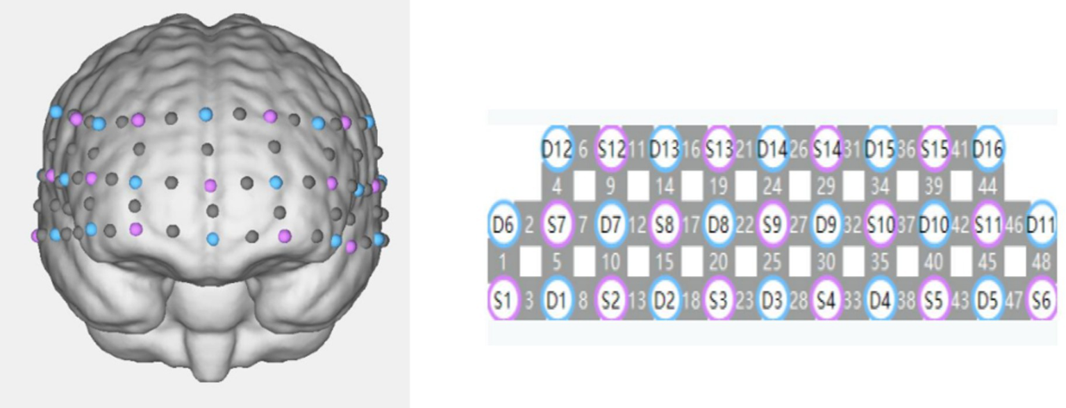 Using the fNIRS device (NirScan, Danyang Huichuang Medical Equipment Co., Ltd., China) to detect spontaneous changes in Hb concentration in 48 channels under resting-state conditions, non-invasively measuring the concentrations of HbO2, HbR, and HbT through changes in light intensity. The device can be configured to a maximum of 48 effective channels, positioned according to the international 10–20 system, covering the frontal and temporal lobes (Figure 2). Based on the device’s coordinates, the 48 channels are divided into each brain region, thus allowing the selection of specific regions of interest (ROIs) in the study. The ROIs in this study include the left dorsolateral prefrontal cortex (channels CH32, 44–48), the right dorsolateral prefrontal cortex (channels CH24, 37, 38, 39, 41, 42), the left medial prefrontal cortex (channels CH9–12, 25, 27, 29–31), the right medial prefrontal cortex (channels CH4–8, 21–23, 26, 28, 40), the left temporal lobe (channels CH13, 15, 16, 33–36), and the right temporal lobe (channels CH1–3, 17–20). Before wearing, first determines the midpoint of the top of the head (Cz), which is the intersection of the line from the root of the nose to the occipital protuberance and the line connecting the bilateral external auditory meatus. After putting on the cap, adjust the probes to ensure that the position of the optode cap worn by all subjects is consistent, and start data collection after the signal is stable, scanning the brain continuously for 10 min in a resting state.