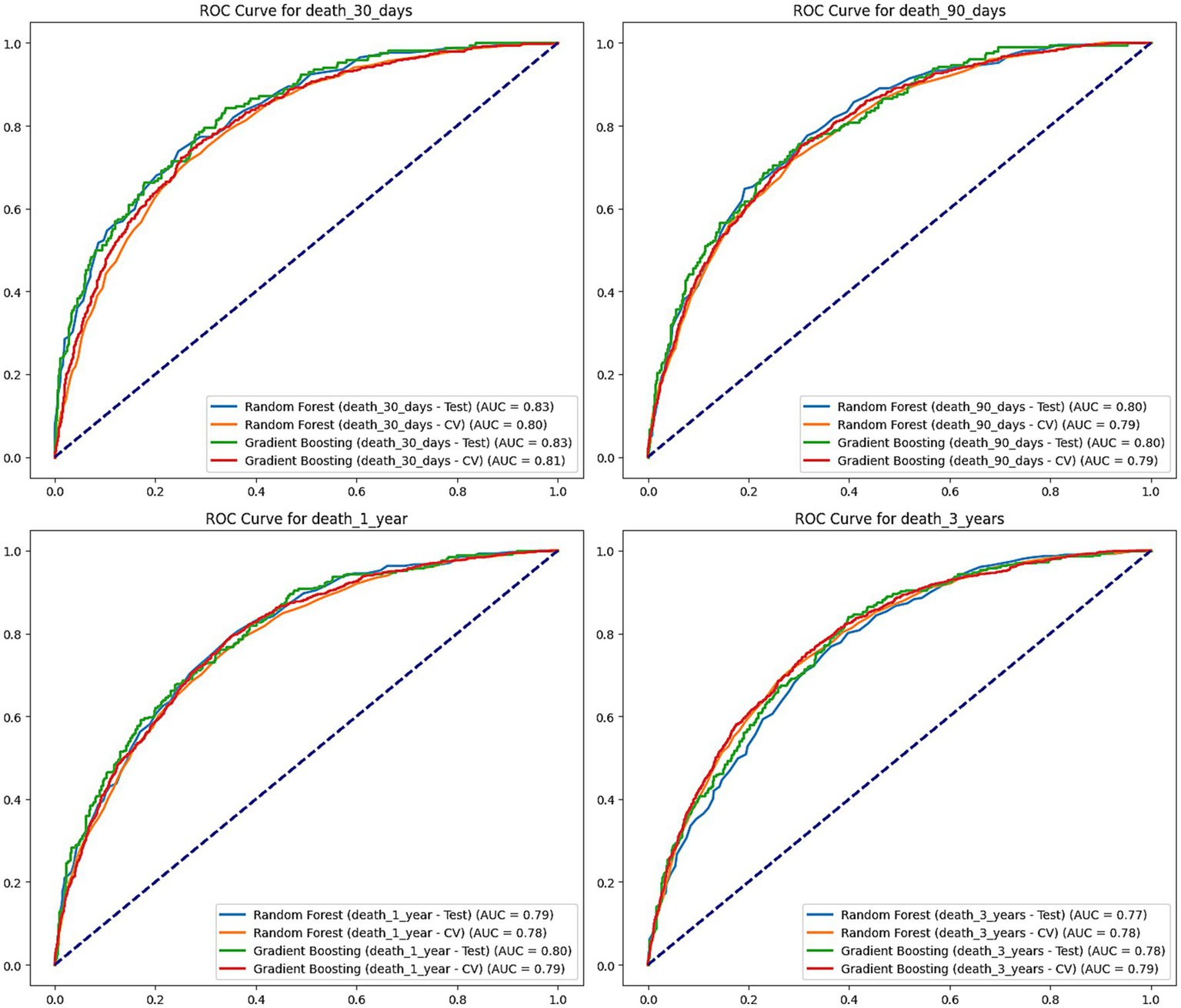 Figure 5. ROC curves for mortality prediction at 30 days, 90 days, 1 year, and 3 years. This figure shows the Receiver Operating Characteristic (ROC) curves for Random Forest and Gradient Boosting models predicting mortality at 30 days, 90 days, 1 year, and 3 years. The performance of each model is evaluated on both the test set and cross-validation (CV), with the area under the curve (AUC) values shown for each. Random Forest and Gradient Boosting models perform similarly across all time points, with AUC values ranging from 0.77 to 0.83, indicating good predictive performance.