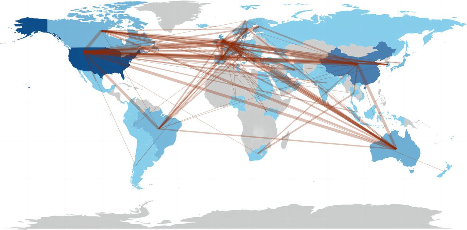 Figure 2 illustrates the distribution of 422 countries/regions across six continents conducting research on exercise therapy for insomnia. The publications are concentrated in Western Europe, East Asia, and North America. Table 2 shows that the country with the highest number of publications is the United States (423 articles), followed by China (213 articles). In contrast, the number of publications in other countries is much lower. Moreover, Table 2 shows that the United States and China have the closest connections in this field, and the United States cooperates closely with China, the United Kingdom, Canada, and Australia. Therefore, China, based on a comparison with United States, should strengthen and establish cooperative relationships with other countries in this research field.