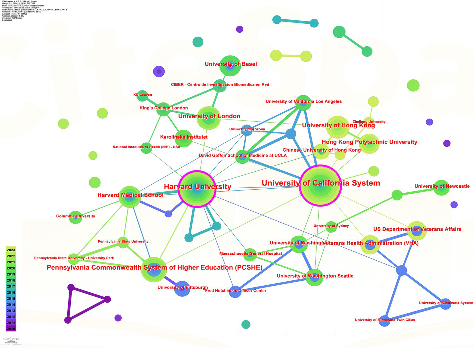 Figure 3 shows the visualization of institutional collaboration in research on exercise therapy for insomnia. The University of California System has a strong collaborative network and relationships with other institutions.