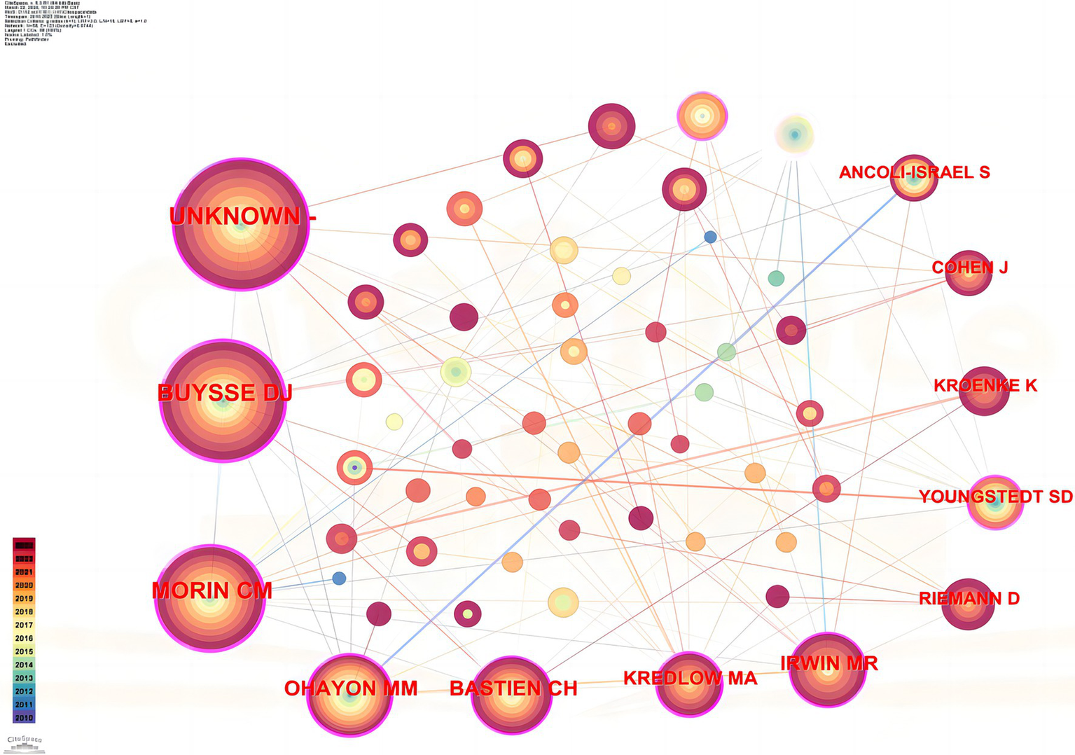 A total of 7,768 authors contributed to research on exercise therapy for insomnia. Table 5 shows the top 10 authors with the highest number of publications in this field. This list is led by Markus Gerber (30 articles), followed by Serge Brand (22 articles) and Edith Holsboer-Trachsler (16 articles), all from the University of Basel. Four of the top 10 authors are from Switzerland, and three are from the United States, indicating that Switzerland and the United States have more outstanding people focusing on the research field of exercise therapy for insomnia.