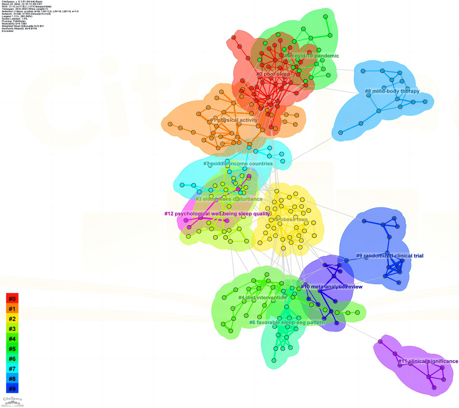 Co-occurrence analysis was conducted to reveal the correlation and structural relationships between institutions, authors, and keywords in the field of exercise for insomnia by analyzing the frequency of their co-occurrence in the same or different documents. Co-occurrence analysis clearly revealed research hotspots, development trends, and cross-fertilization between different keywords in this field. Moreover, cluster analysis was conducted to reveal the inherent structure and patterns of a field of study by grouping similar objects to form different research themes or directions.