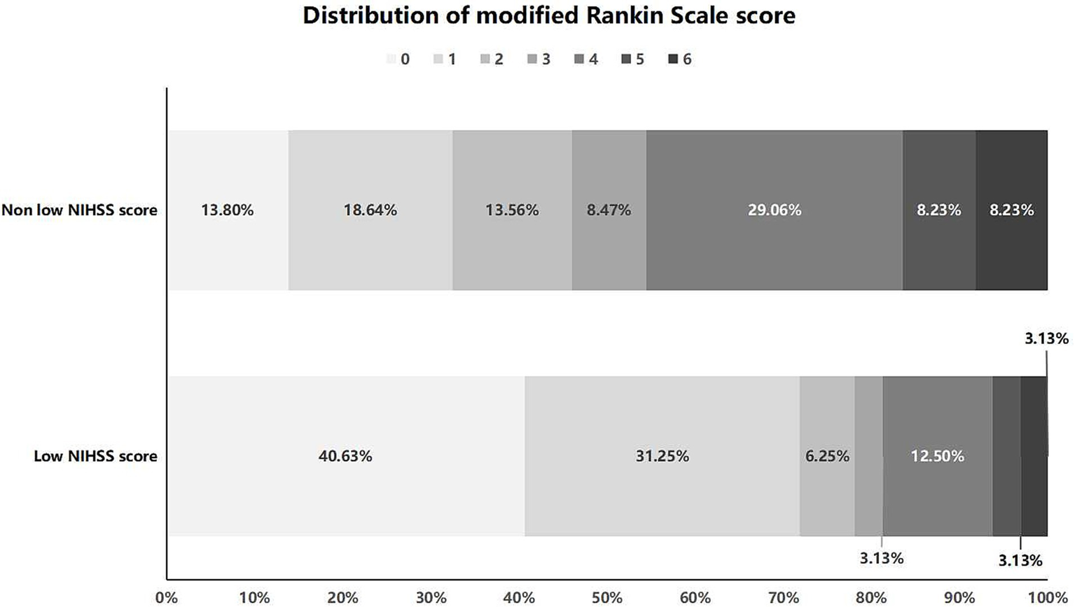 Distribution of mRS score at 3 months after interventional recanalization for patients in the low and non low NIHSS score group. NIHSS, National Institute of Health stroke scale.