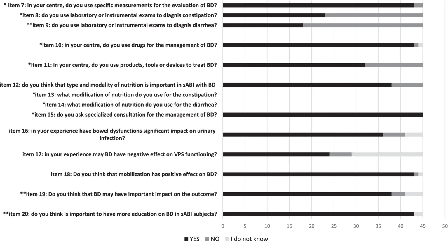 The questionnaire was composed of three sections. The first part concerned the rationale and aim of the study. A second section investigated the demographic characteristics of the clinician who filled out the questionnaire including specialty, institution, site of working center, and number of patients with sABI admitted yearly. The third and last part was composed of 20 items, including 19 close-ended questions with multiple-choice answers (Item 2–20), 4 of which included an open-ended part, and 1 open-ended question (Item 1). Given the lack of literature data, answers were facilitated by providing an even number of response categories without a middle response option stating a “neutral” response. In this regard, responses included percentages, such as “> 50%” or “< 50%,” or “YES” or “NO.” A further option was possible: “I do not know.” As mentioned, four of the close-ended questions included an open-ended part which concerned the management of diarrhea and constipation, in particular laboratory exams (Item 9) and therapeutic strategies (Item 10) employed for these disorders, as well as reasons of BDs effects on patient outcomes (Item 19).