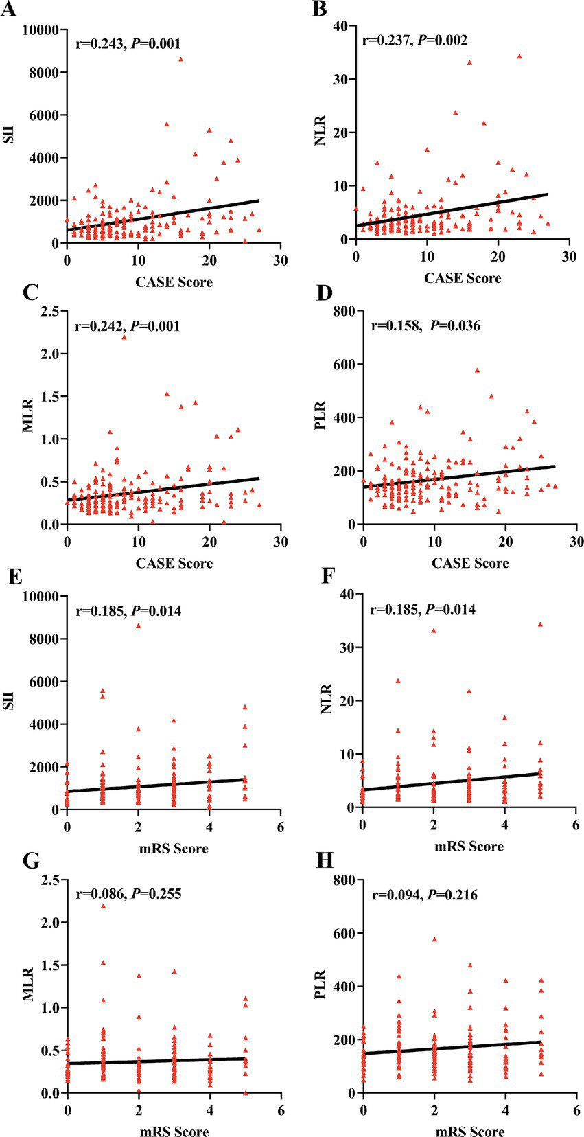 As shown in Figure 2, Spearman correlation analysis showed that SII and NLR were positively correlated with the CASE score (r = 0.243, p = 0.001; r = 0.237, p = 0.002) and the mRS score (r = 0.185, p = 0.014; r = 0.185, p = 0.014) in AE patients. Interestingly, we also found that MLR and PLR were positively correlated with the CASE score (r = 0.242, p = 0.001; r = 0.158, p = 0.036), but no correlation was observed between the mRS score and MLR or PLR (r = 0.086, p < 0.255; r = 0.094, p < 0.216).