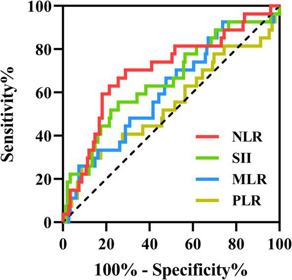 Figure 4. The predictive value of SII, NLR, MLR and PLR on the ICU admission. ROC curves of the SII, NLR, MLR and PLR for predicting ICU admission in AE patients. ROC, receiver operating characteristic; ICU, intensive care unit; AE, autoimmune encephalitis; SII, systemic immune-inflammation index; NLR, neutrophil-to-lymphocyte ratio; MLR, monocyte-to-lymphocyte ratio; PLR, platelet-to-lymphocyte ratio.