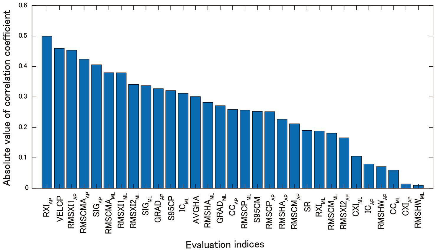 Table 1 lists the 31 balance evaluation indices used in this study. The subscripts AP and ML indicate indices for the sagittal and frontal planes, respectively. These indices were roughly classified as COP, sway magnitude, COM control, and head acceleration control indices. The conventional COP-based indices were composed of the root mean square (RMS) of the pressure center (RMSCPAP, RMSCPML), area of the 95% confidence ellipse of the COP (S95CP), and velocity of the COP trajectory (VELCP).