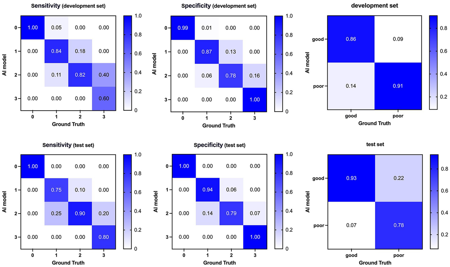 Figure 3. Confusion matrices and performance of our AI model compared with ground truth on the development (top) and test (bottom) dataset. AI, Artificial Intelligence.