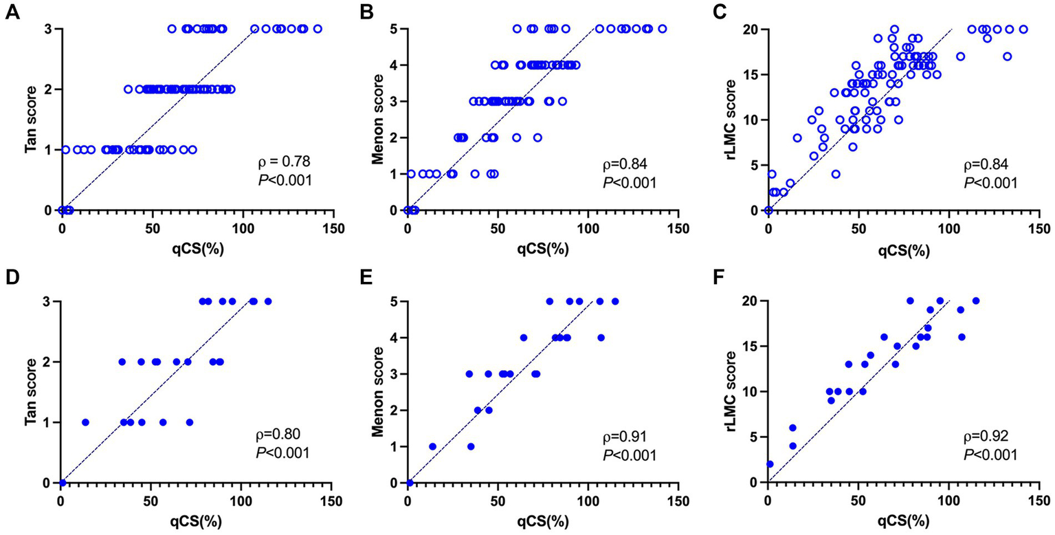 Figure 5. Correlation analysis between the qCS and three manual visual scoring methods in the development set (A–C) and test set (D–F), respectively. qCS, quantitative collateral score; rLMC, regional leptomeningeal collateral.