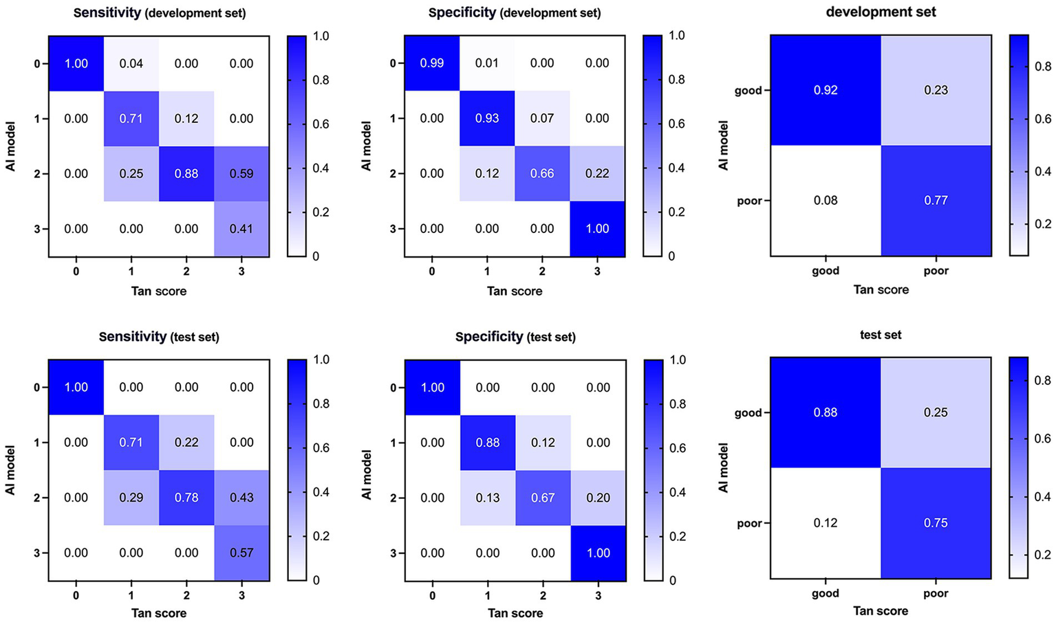 Figure 6. Confusion matrices and performance of our AI model compared with visual Tan score on the development (top) and test (bottom) dataset. AI, Artificial Intelligence.
