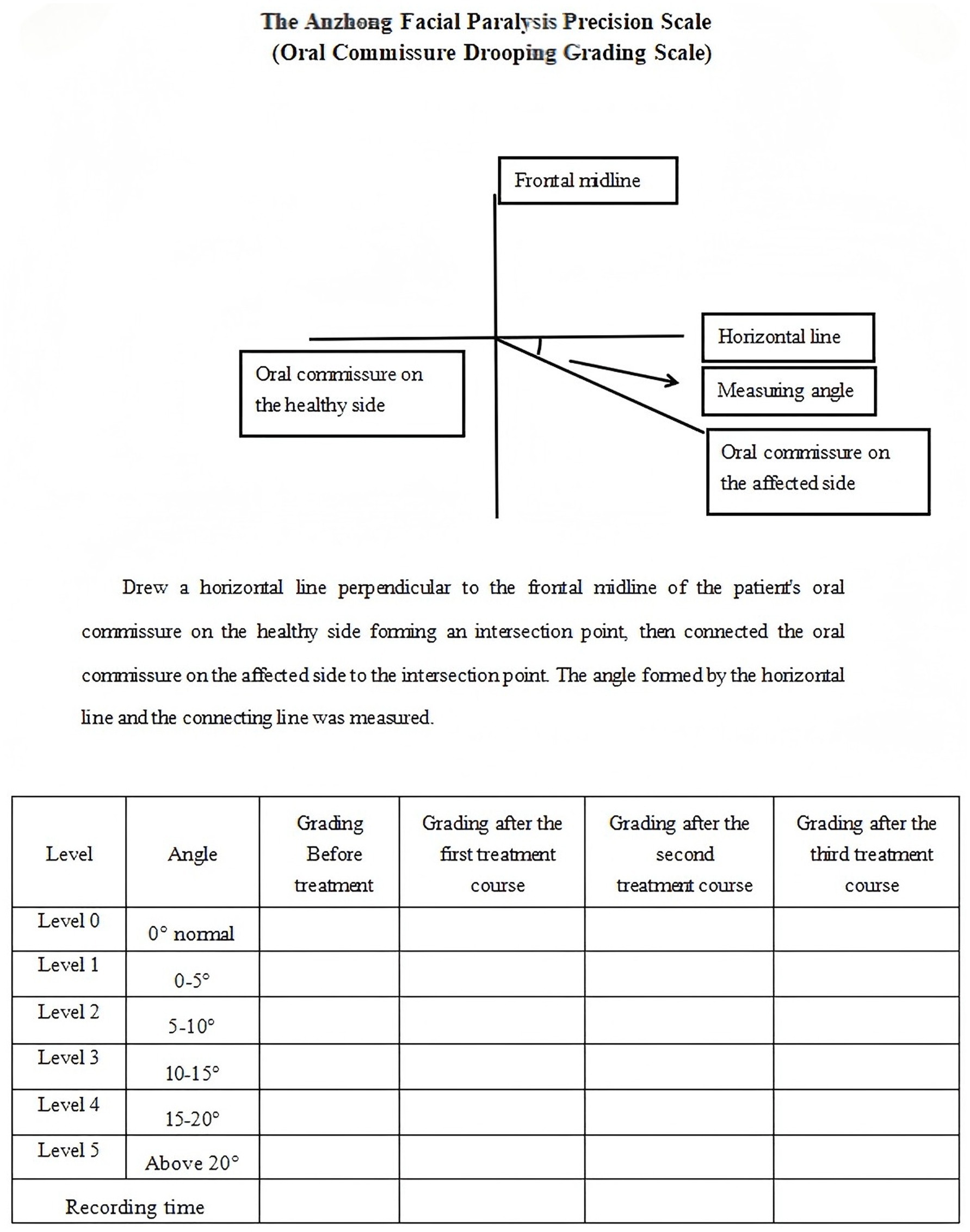 According to the Anzhong Facial Paralysis Precision Scale (Oral Commissure Ptosis Grading Scale), we drew a horizontal line perpendicular to the frontal midline of the patient’s oral commissure on the healthy side forming an intersection point, then connected the oral commissure on the affected side to the intersection point. The angle formed by the horizontal line and the connecting line was measured and analyzed. When the angle approached 0, it was considered normal. It was divided into four levels, 0–5. The lower the level, the less skewed oral commissure, and the better the recovery.