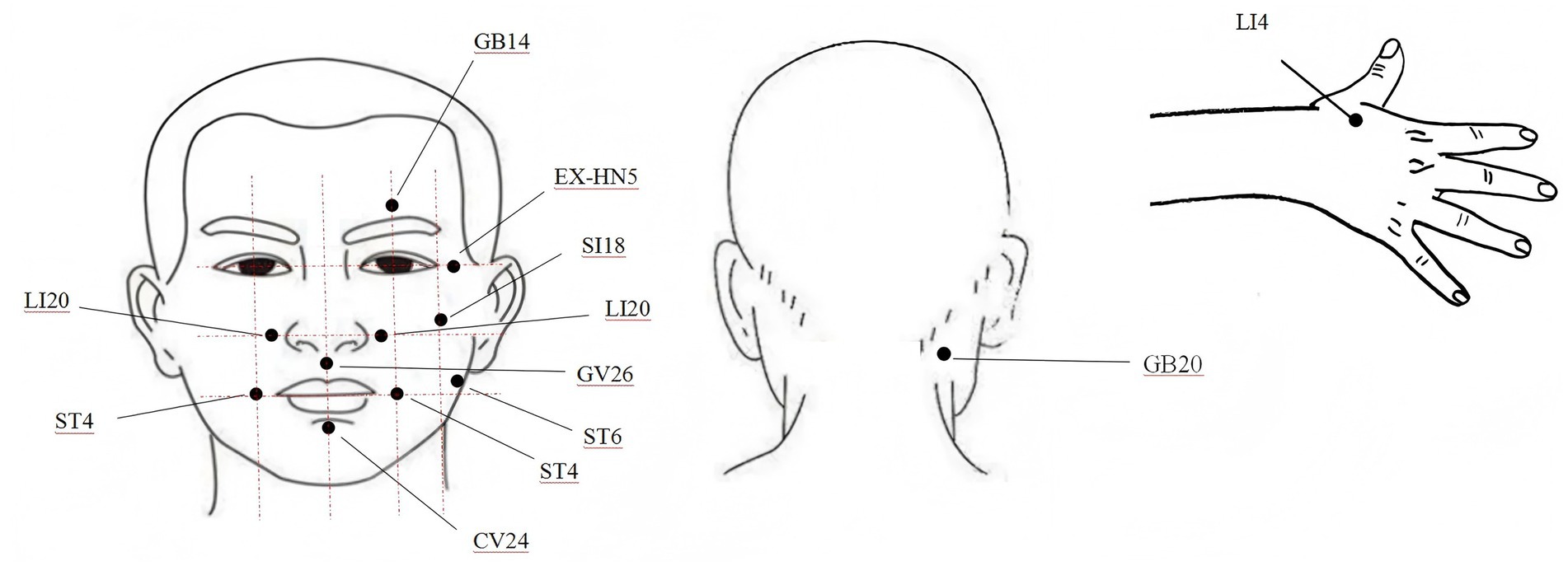 Patients took a sitting position, and the local skin of acupoints were routinely disinfected and punctured. The main acupoints selected were the head and face acupoints, including GB14 (Yangbai), SI18 (Quanliao), LI20 (Yingxiang), GV26 (Shuigou), ST4 (Dicang), CV24 (Chengjiang), EX-HN5 (Taiyang), ST6 (Jiache), GB20 (Fengchi), and LI4 (Hegu), as shown in Figure 2.