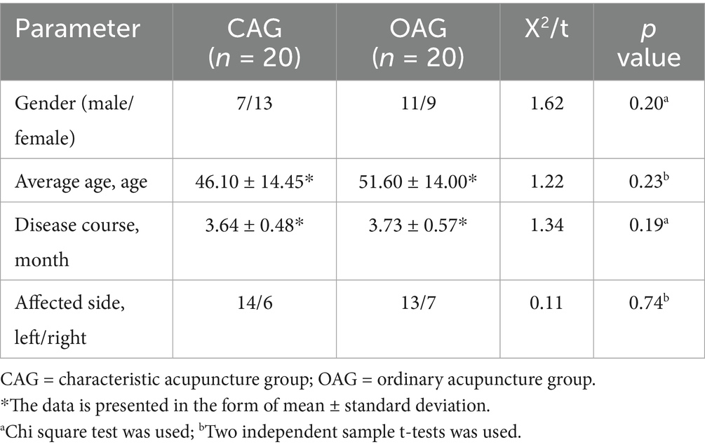 The study population comprised 51 patients with IFP who were recruited at the study site. In total, 43 participants were enlisted, while only 40 IFP patients completed a 3-course study. The designated researchers who did not participate in the trial were responsible for recruiting participants, while another independent researcher who did not participate in treatment and recruitment generated a random allocation sequence. The generated random numbers were placed in opaque sealed envelopes using a random number table, and envelopes were randomly selected in the order of the patients’ medical visits. The participants were divided into the characteristic acupuncture group (CAG, n = 20) and the ordinary acupuncture group (OAG, n = 20) in a 1:1 ratio. In this study, patients, outcome assessors, and statistical analysts were blinded to the treatment, and patients were treated in separate rooms to reduce communication. Due to the particularity of acupuncture manipulation, it is impossible to achieve blindness for the operator.