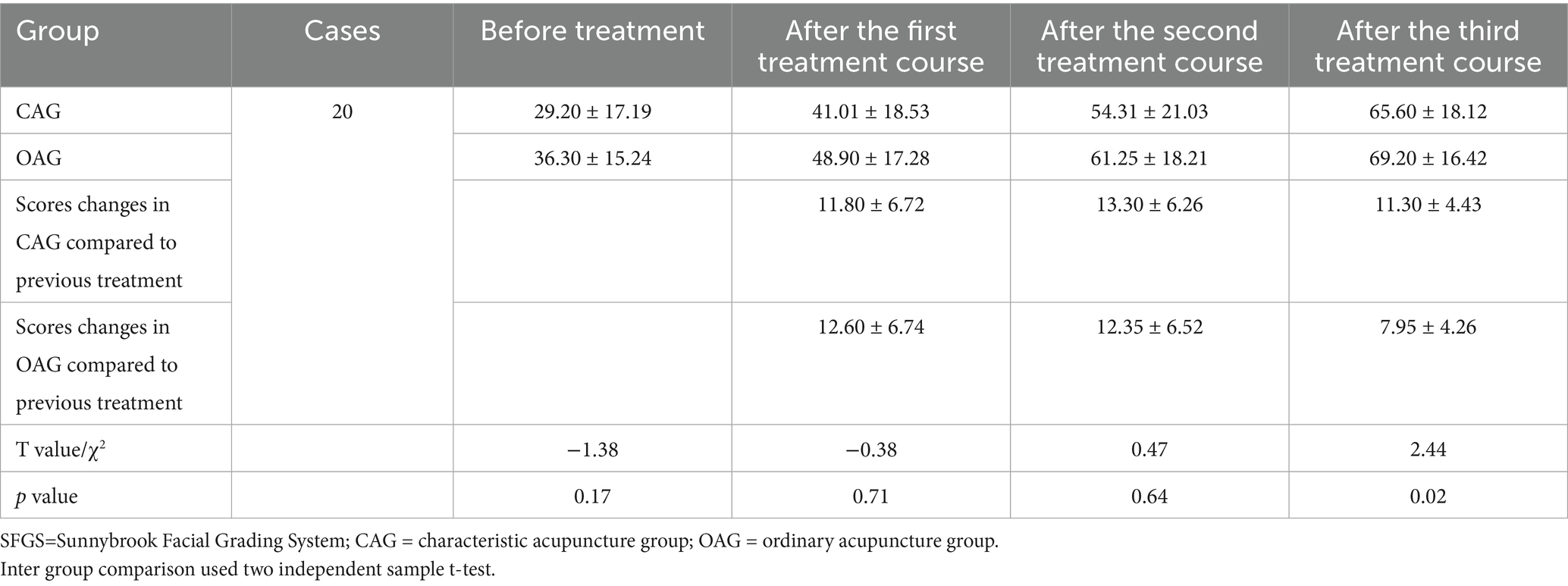 There was no statistical significance in SFGS scale scores between the two groups before treatment (p > 0.05), indicating comparability. After the first and second treatment courses, there was no statistical significance in scores changes between the two groups (p > 0.05). After the third treatment course, the scores changes between the two groups began to show statistical significance (p < 0.05), the CAG group demonstrated superior therapeutic efficacy compared to the OAG group, as shown in Table 3.