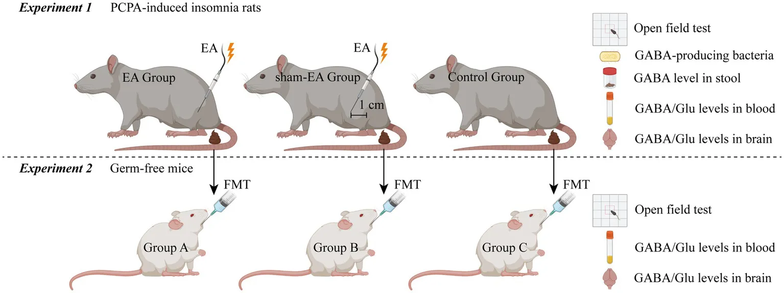The study will use glutamate (Glu) concentrations of p-chlorophenylalanine (PCPA) -induced insomnia rat model to examine whether EA at specific acupoints can increase GABA levels in the brain and plasma by enhancing the abundance of GABA-producing gut bacteria. A second experiment will transplant stool from insomnia rats into germ-free mice to evaluate the causal role of microbiota in insomnia pathology. Primary outcome measures include changes in GABA and Glu levels, data about the open field test, and gut microbiota composition.