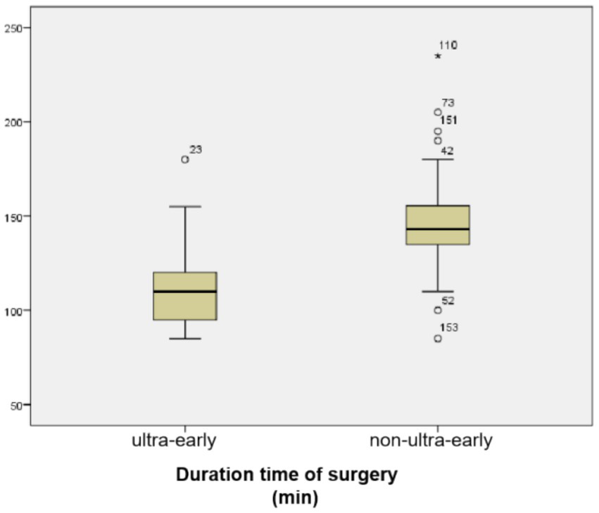 The mean operative time in the ultra-early group was (112.39 ± 22.71) min, and in the non-ultra-early group was (146.19 ± 20.02) min. When comparing between the two groups, the operative time required in the ultra-early group was significantly shorter than that in the conventional group; there was a statistical difference (p = 0.000) (Table 1; Figure 2).