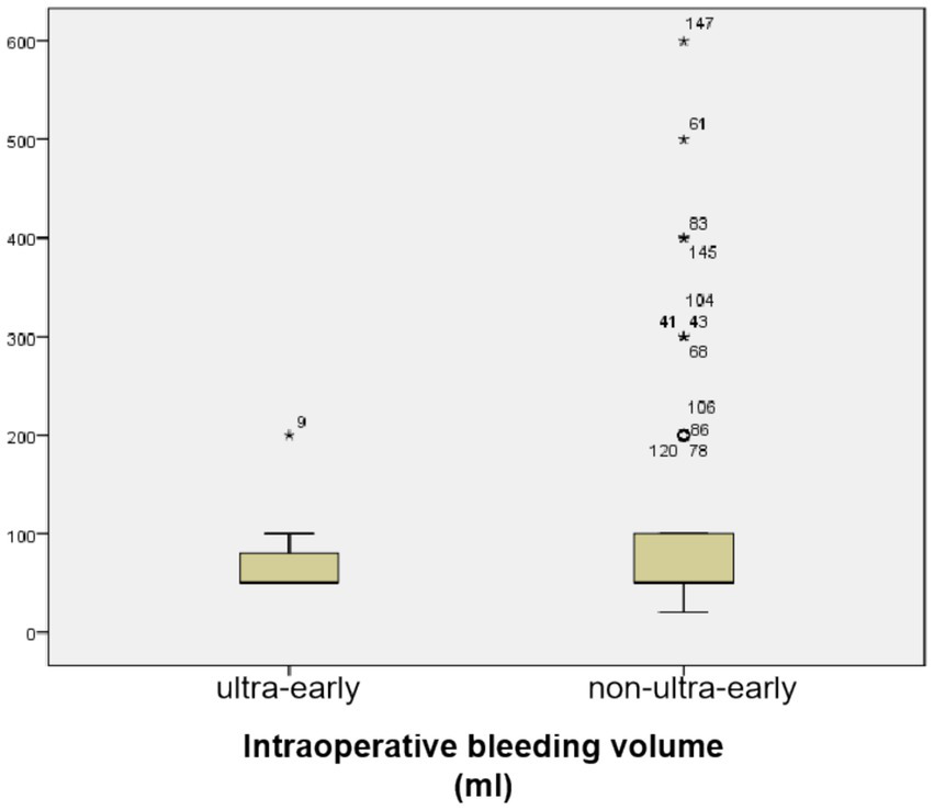 The mean bleeding volume in the ultra-early group was (70.00 ± 33.98) ml, and in the non-ultra-early group it was (87.39 ± 88.87) ml; there was no statistically significant difference in the comparison between the two groups (p = 0.519) (Table 1; Figure 3).