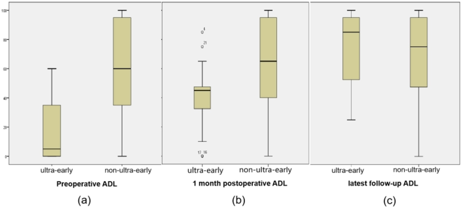 (A) The preoperative ADL score (17.17 ± 20.55) in the ultra-early group were significantly lower than those in the non-ultra-early group. (B) 1 month postoperative ADL score (41.3 ± 22.27) in the ultra-early group were significantly lower than those in the non-ultra-early group. (C) There was no significant difference in ADL scores between the two groups of patients at long-term postoperative follow-up.
