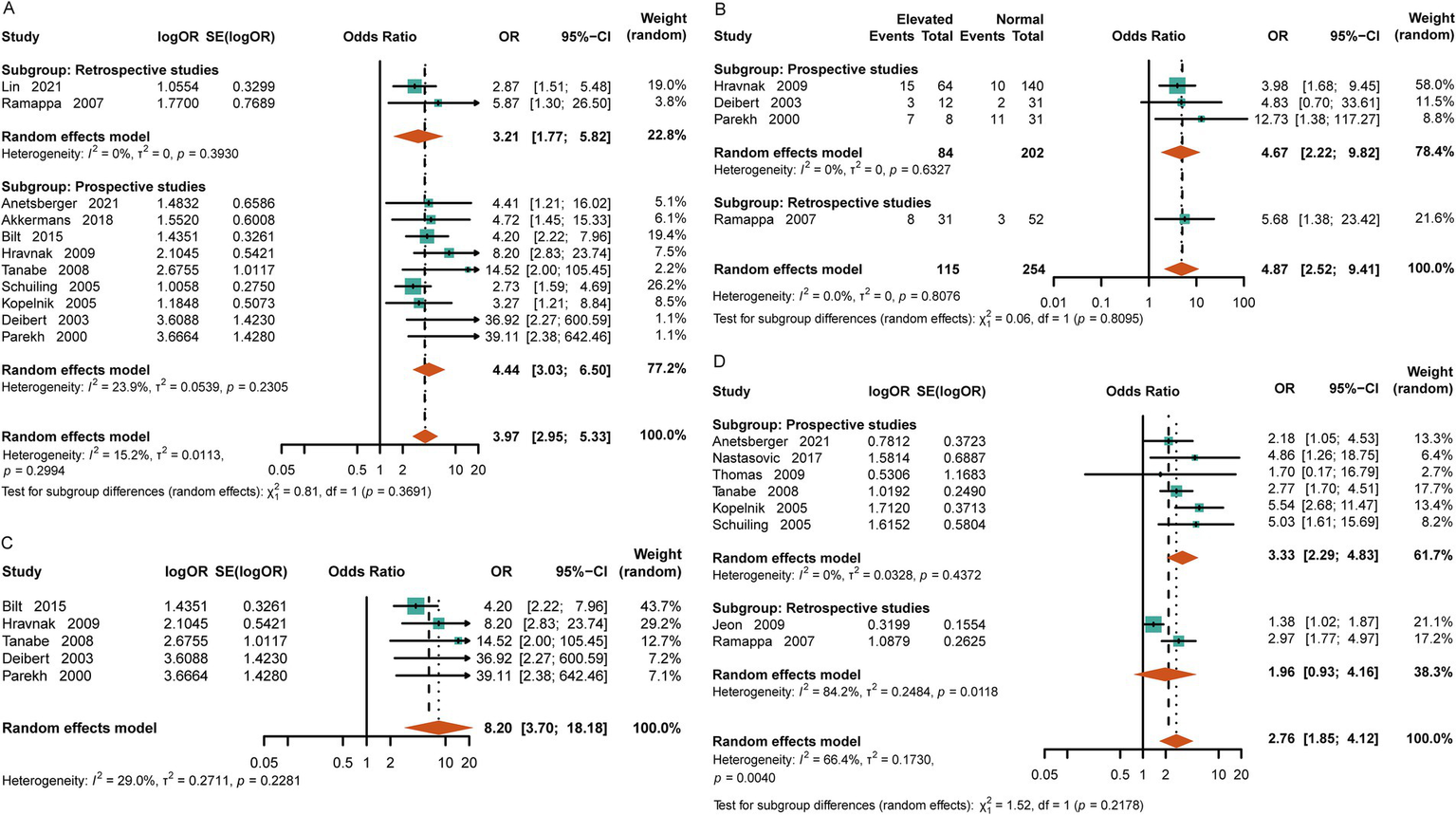 Compared to the normal-cTn group, the patients with elevated cTn levels were more likely to experience cardiac dysfunction after SAH [OR = 3.97, 95%CI (2.95, 5.33), p = <0.0001, I2 = 15.2%] (Figure 4A). Based on the original literature, we further classified cardiac dysfunction into arrhythmia and ventricular wall motion abnormality groups. Upon analysis, it was found that the patients with increased levels of cTn had a higher incidence of emerging arrhythmia events [OR = 4.87, 95%CI (2.52, 9.41), p < 0.0001, I2 = 0] (Figure 4B). The likelihood of experiencing abnormal ventricular wall motion in the elevated-cTn group after SAH was 6.59 times higher than that in the control group [OR = 8.20, 95%CI (3.70, 18.18), p <0.00001, I2 = 29%] (Figure 4C). Furthermore, increased cTn levels were associated with neurogenic pulmonary edema [OR = 2.76, 95%CI (1.85, 4.12), p < 0.0001, I2 = 66.4%] (Figure 4D).