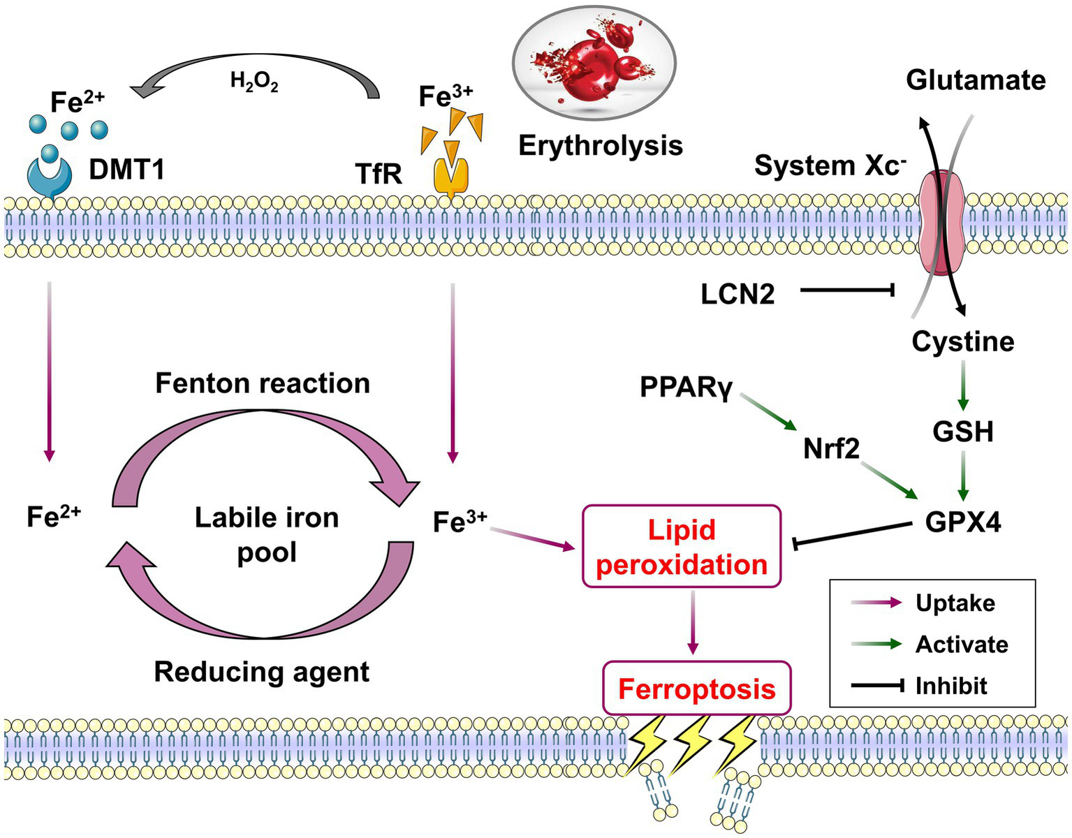 The core mechanisms and related pathways of ferroptosis post-ICH. Overloaded iron in peri-hematoma enters the cells via the uptake of TfR and DMT1, resulting in the form of labile iron pool to serve as the catalyst for the initiation of ferroptosis. Divalent iron (Fe2+) could generate highly toxic hydroxyl radicals through the Fenton reaction and induce lipid peroxidation. The system Xc− and its downstream GSH/GPX4 pathway together constitute a critical reduction system against the lipid peroxidation of ferroptosis process. The activation of PPARγ/Nrf2 pathway could inhibit ferroptosis post-ICH via promoting GPX4 expression.