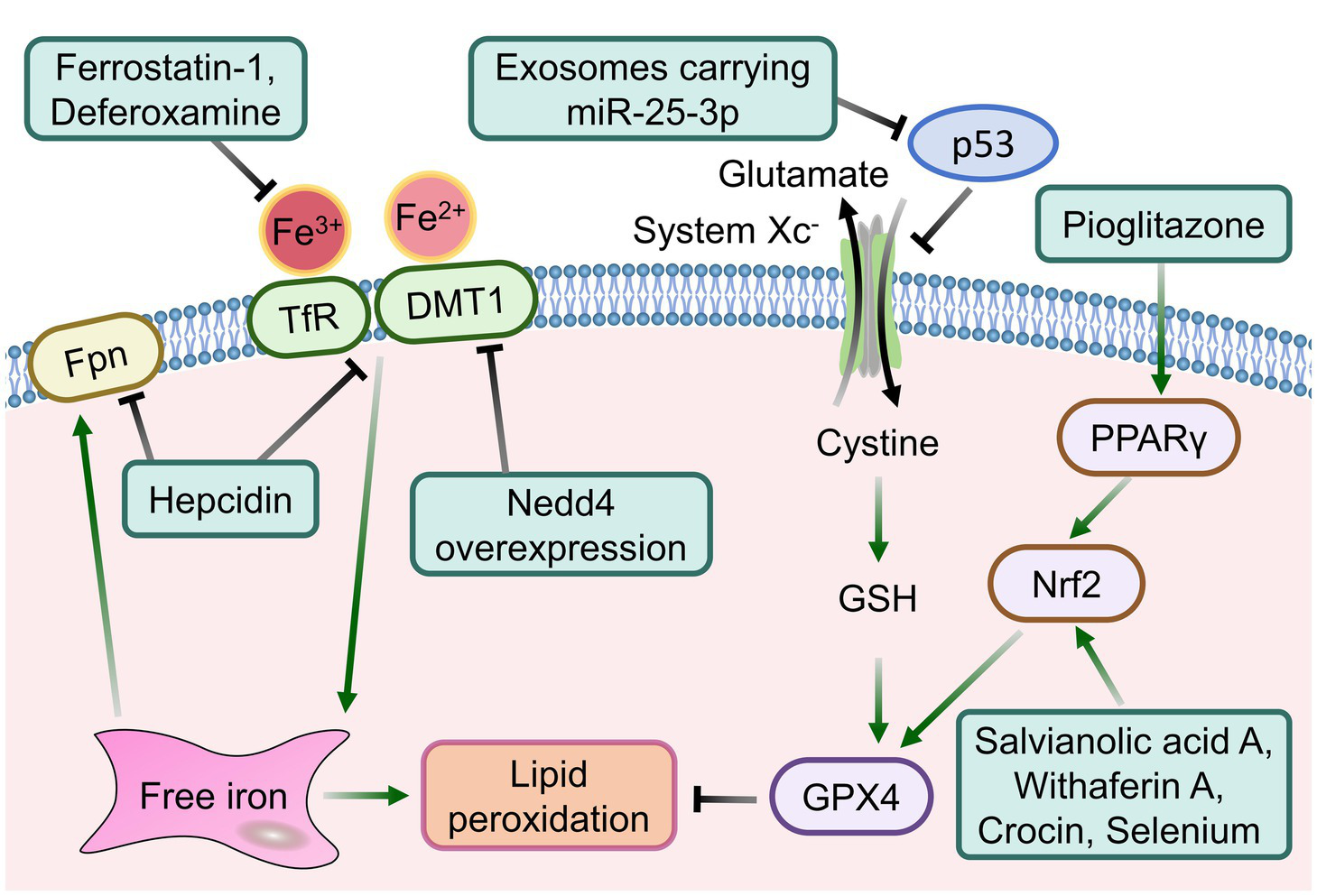 | Pioglitazone | PPARγ | Promoted GPX4 expression | (46) |