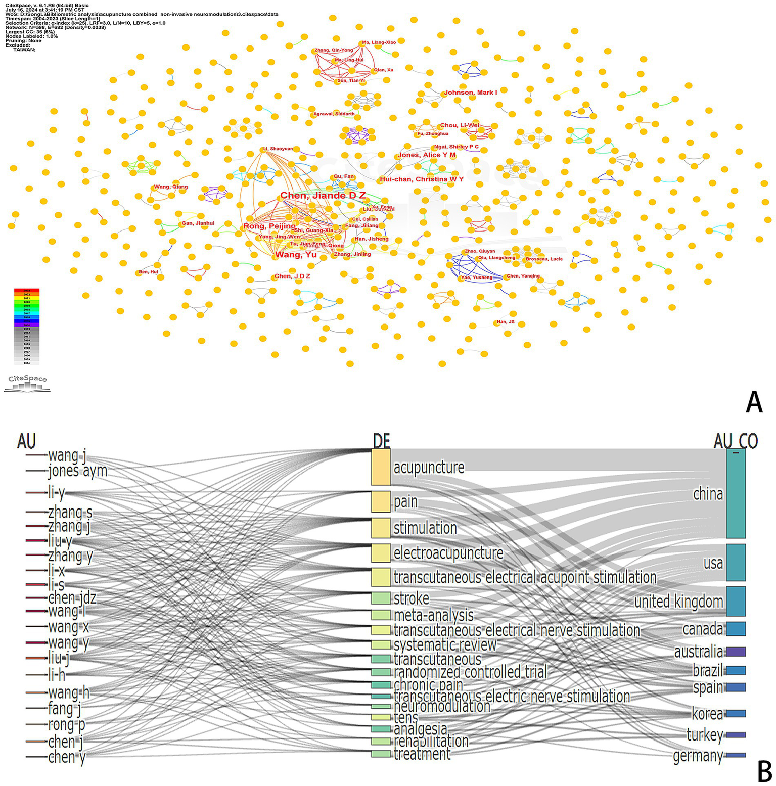 (A) Author distribution in the research field of acupuncture combined with non-invasive neuromodulation. (B) Analysis of the relationship between authors, keywords, and countries.