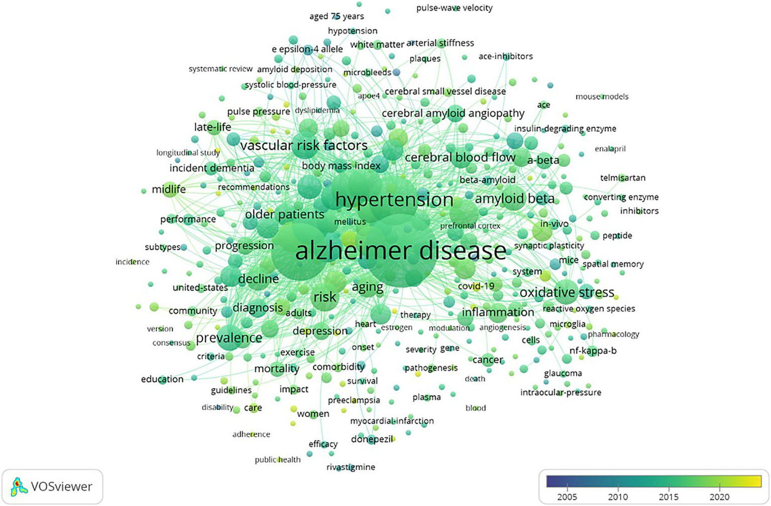 Literature on AD and hypertension was retrieved from the Web of Science Core Collection (WoSCC) database between 2004 and 2023. Data regarding countries, institutions, authors and journals were sourced from WoSCC. CiteSpace and VOSviewer were used for data visualization, including author collaboration, timelines view of references, reference bursts and overlay visualization maps of keywords. Excel 2018 software was used for the statistical analysis.