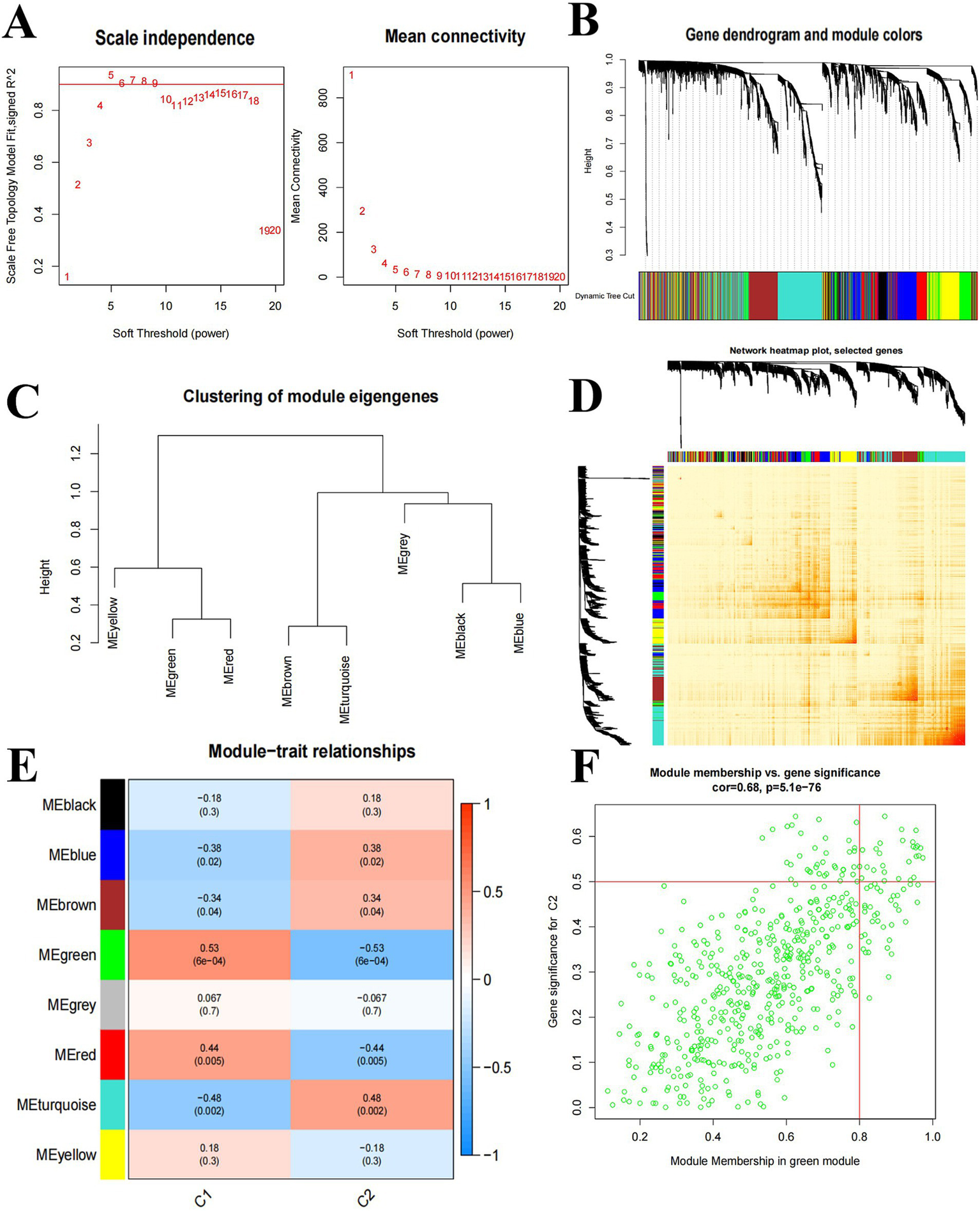 Weighted network analysis between Cluster C1 and Cluster C2. (A) Determination of soft threshold power. (B) Cluster tree dendrogram of co-expression modules; different colors indicate different co-expression modules. (C) Representation of clusters of module signature genes. (D) Representative heat map of correlations between 8 key modules. (E) Correlation analysis of module signature genes with clinical status. (F) Scatter plots between MEgreen module genes and Cluster2 significantly different genes.