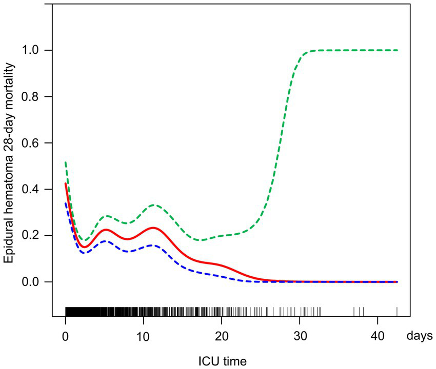 Epidural hematoma (EDH) is one of the common diseases in neurosurgery (1–3). It refers to the collection of blood that forms a hematoma within the potential space between the dura mater and the inner table of the skull (4, 5). It is usually caused by head trauma that results in skull fractures or temporary deformation of the skull, which then tears the meningeal arteries or venous sinuses located in the grooves, leading to bleeding (6–9). EDH is more common in adolescents and young adults, especially males between the ages of 15 and 50, with a relatively lower incidence in infancy (10, 11). The incidence of EDH accounts for 1 to 4% of craniocerebral injuries, 2 to 3% of closed craniocerebral injuries, and 25 to 30% of all intracranial hematomas (12, 13). The clinical manifestations of EDH typically include disturbances of consciousness, increased intracranial pressure, and neurological signs (14, 15). Disturbances of consciousness may present as a pattern of coma-arousal-coma, increased intracranial pressure may be accompanied by symptoms such as headache, nausea, and severe vomiting, and neurological signs may include central facial paralysis and hemiplegia, severe cases may result in disability or death (16, 17). The mortality rate of EDH ranges from 10 to 25%, with the main cause of death not being the hematoma itself, but rather the secondary damage to the brainstem caused by the formation of brain herniation (18, 19). The challenge in treating EDH lies in early diagnosis and timely management, as any delay can significantly increase the risk of mortality and disability. In light of this challenging clinical issue, there is an urgent need for a predictor of mortality in EDH to guide clinical diagnosis and treatment.