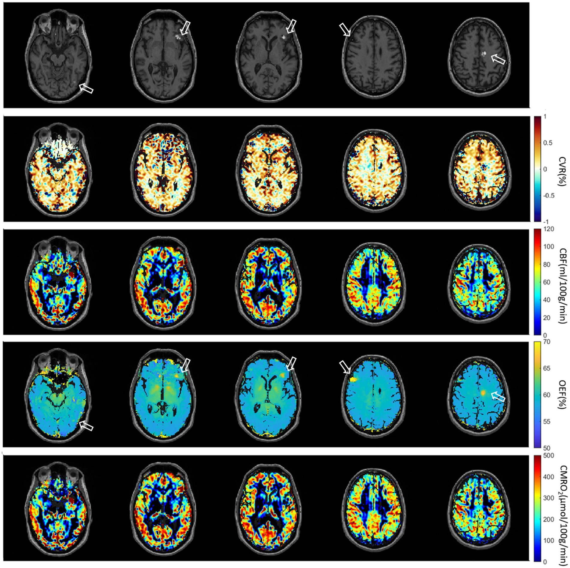 The second patient with multiple brain metastases (melanoma) is presented in Figure 7. The metastases were located at gyrus rectus on the left side (first column), in the frontal operculum on the left side (second column and third column), frontal lobe on the right side (fourth column) without CET1W-hyperintersities, and cingulate gyrus on the left side (fifth column). Brain ROIs were masked and different parameter maps within the brain were overlaid on CET1W. The brain ROIs were defined according to CET1W. White matter was not intentionally excluded. Each parameter displayed abnormalities in different locations. OEF showed enhancements at the location with abnormal CET1W. CBF was increased at the first location but decreased at the last location. CVR was decreased in some metastasis locations.