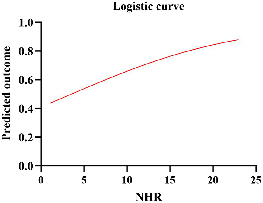 The inflammatory immune response plays a crucial role in the pathophysiology, treatment outcomes, and prognosis of ischemic stroke (10). Among leukocytes, neutrophils are the first immune cells to increase in circulation shortly after the onset of ischemic stroke (11). Neutrophils in the blood infiltrate ischemic or infarcted tissue through the compromised blood–brain barrier (BBB) and release inflammatory mediators, thereby increasing the risk of BBB disruption, reperfusion injury, hemorrhagic transformation, and malignant brain edema (12). High-density lipoprotein cholesterol (HDL-C) regulates macrophages and adipocytes via cholesterol transporters, exerting anti-inflammatory (13) and anti-atherosclerosis effects (14). As a potential inflammatory marker, the neutrophil-to-high-density lipoprotein cholesterol ratio (NHR) has demonstrated certain prognostic value. This blood indicator is inexpensive and readily available. Huang et al. found that an elevated NHR is a potential predictor of long-term mortality and recurrence rates in elderly patients with acute myocardial infarction (15). A previous study indicated that NHR may be associated with an increased risk of adverse short-term outcomes following intravenous thrombolysis in AIS patients (16). However, its correlation with futile recanalization at mTICI3 remains unclear. This study aimed to investigate the relationship between NHR and adverse prognosis in LVO patients who achieved complete recanalization after MT.