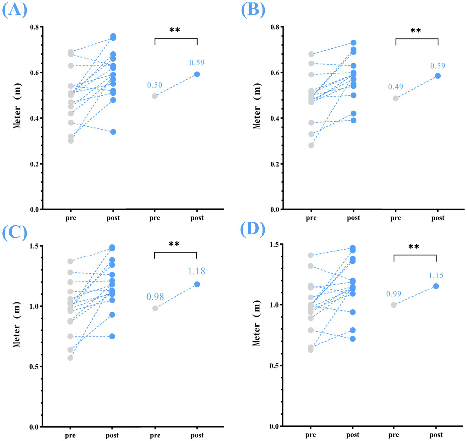 Spatial parameters—changes in step and stride length (left and right) between pre- and post-home-based VT. The following abbreviations are used: (A) step length (left); (B) step length (right); (C) stride length (left); (D) stride length (right); The circles on the left represent individual participants; the circles on the right represent the group mean for the pre- and post-intervention assessments.