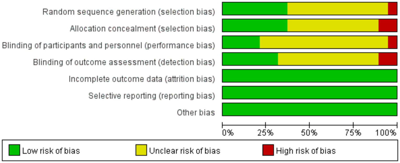 Two researchers independently assessed the quality of the included studies using the Cochrane Risk of Bias tool (Revman 5.4). The risk of bias was evaluated in seven areas: whether the random allocation was used, whether the intervention allocation was concealed, whether participants and investigators were aware of the grouping, whether outcome data were complete (someone dropped out halfway through), whether the assessor’s confidentiality was maintained, and whether there was selective reporting and other sources of bias (e.g., treatment criteria, adverse events, etc.). To address controversial matters, consult with a third expert investigator if necessary.