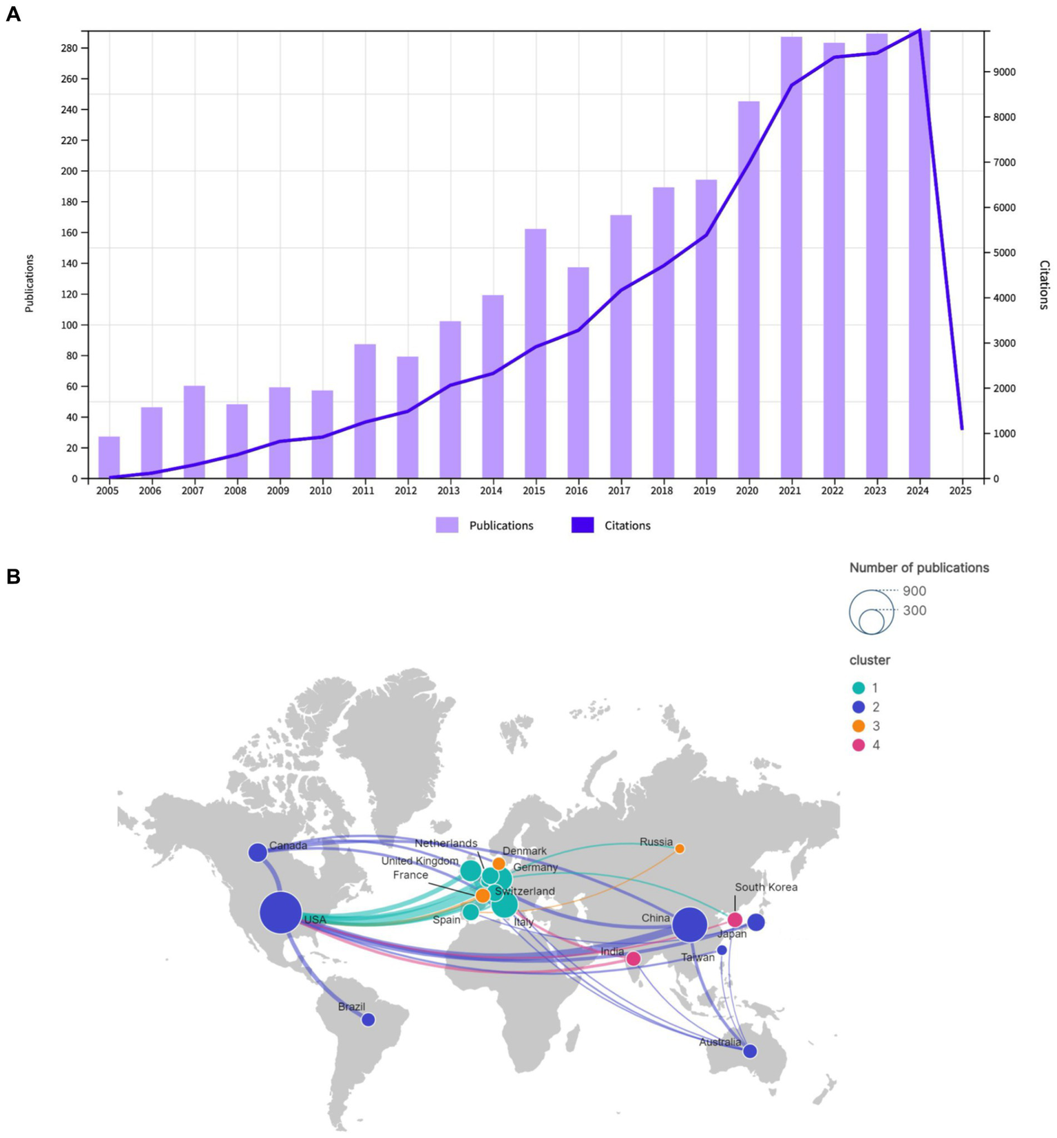 A total of 2,931 publications were published by 92 countries and 3,539 institutions. A total of 57 countries and 139 institutions published at least five and ten articles, respectively, in this field. In terms of publication volume, the top five countries were the United States (778 publications), China (545 publications), Italy (316 publications), Germany (273 publications), and England (184 publications), as illustrated in Table 1. As illustrated in Figure 2B, the geographical distribution of cooperative endeavors among nations is depicted. The nodes, which represent countries, are sized according to the number of publications they have received. The upper right corner of the figure demonstrates the node sizes for publication counts of 300 and 900. The presence of lines connecting the nodes signifies cooperative interactions between countries, with the thickness of the lines denoting the frequency of collaboration. The map is color-coded into clusters and includes both the number of publications from each country as well as the strength of their collaborations. The map divides countries into four different clusters based on their collaborative relationships. Cluster 1: This cluster primarily includes countries/regions from Europe, such as Germany, England, Spain, Switzerland, Italy, and Netherlands. Cluster 2: This cluster includes countries/regions such as the United States, China, Canada, Japan, Australia, Brazil, and Taiwan. Cluster 3: This cluster includes countries/regions like France, Denmark, and Russia. Cluster 4: This cluster includes countries/regions like South Korea and India.