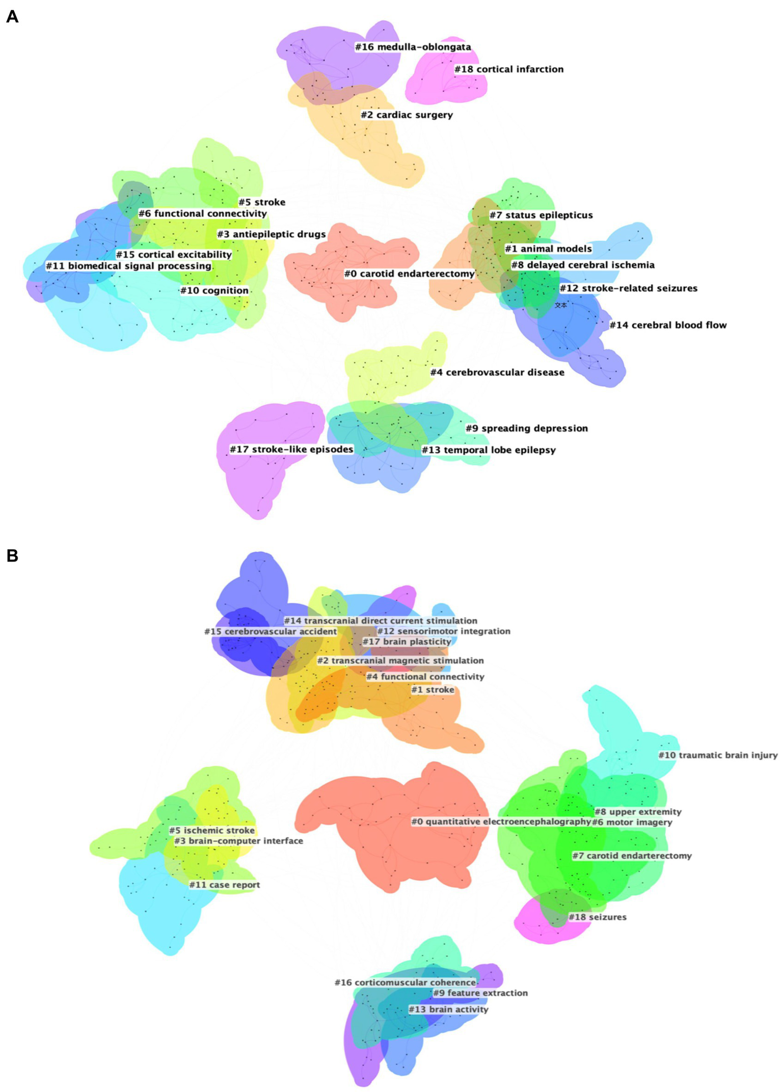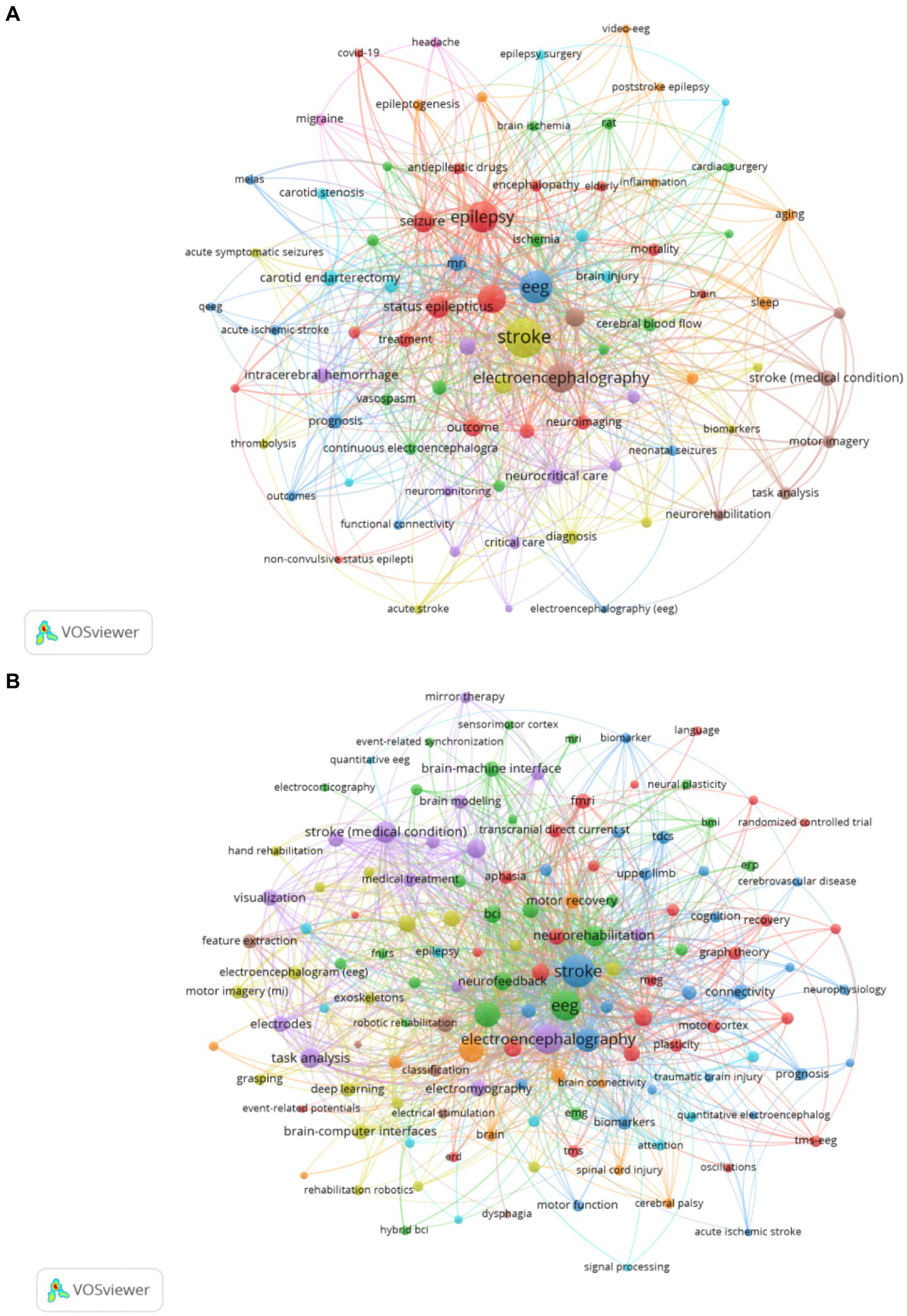Keywords are a high-level summary of the topic and content of the article. An analysis of keyword co-occurrence can reflect the hotspot and trend of research in the field (25). This study analyzes the keyword co-occurrence patterns across two distinct categories of EEG research in stroke. Table 5 shows the top 20 keywords from both Dataset 2 and Dataset 3 ranked by TLS. In Dataset 2 which includes 1,207 articles focused on “EEG in acute stroke and its early complications,” the keyword co-occurrence network (Figure 5A) highlights terms like “stroke,” “EEG,” and “epilepsy” as central nodes emphasizing the focus on EEG applications for managing acute stroke complications such as seizures and non-convulsive status epilepticus. Figure 1 showcases a total of 83 keywords with a minimum co-occurrence frequency of seven. Other significant terms such as “ischemic stroke,” “MRI,” and “intracerebral hemorrhage” reflect the intersection of EEG studies with imaging and other neurological complications. This network illustrates how EEG is used to monitor and manage the early consequences of stroke indicating the importance of EEG in understanding and addressing stroke-induced brain changes during the acute phase. Dataset 3 which includes 1,724 articles focusing on “EEG in neurological rehabilitation,” shows a different pattern in its keyword co-occurrence network (Figure 5B). This figure displays a network of 137 keywords all of which appear with a minimum frequency of seven. These central terms like “brain-computer interface (BCI),” “motor imagery (MI),” and “neurorehabilitation” are prominent reflecting the shift in focus toward using EEG in stroke recovery particularly in enhancing rehabilitation strategies through BCI systems. Keywords such as “functional connectivity,” “training,” and “rehabilitation” are tightly linked indicating the growing interest in leveraging EEG to promote motor recovery and brain plasticity in the chronic phase of stroke. Moreover terms like “virtual reality (VR)” suggest an expanding interest in integrating advanced technologies with EEG-based rehabilitation. Comparing the keyword co-occurrence networks of the two categories reveals clear differences: acute stroke research is primarily concerned with monitoring and managing immediate stroke-related complications while the rehabilitation category emphasizes long-term recovery and functional improvement through EEG-based interventions.